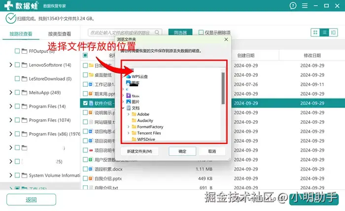 步骤3:在“浏览文件夹”的弹窗中选择需要存放文件的位置。