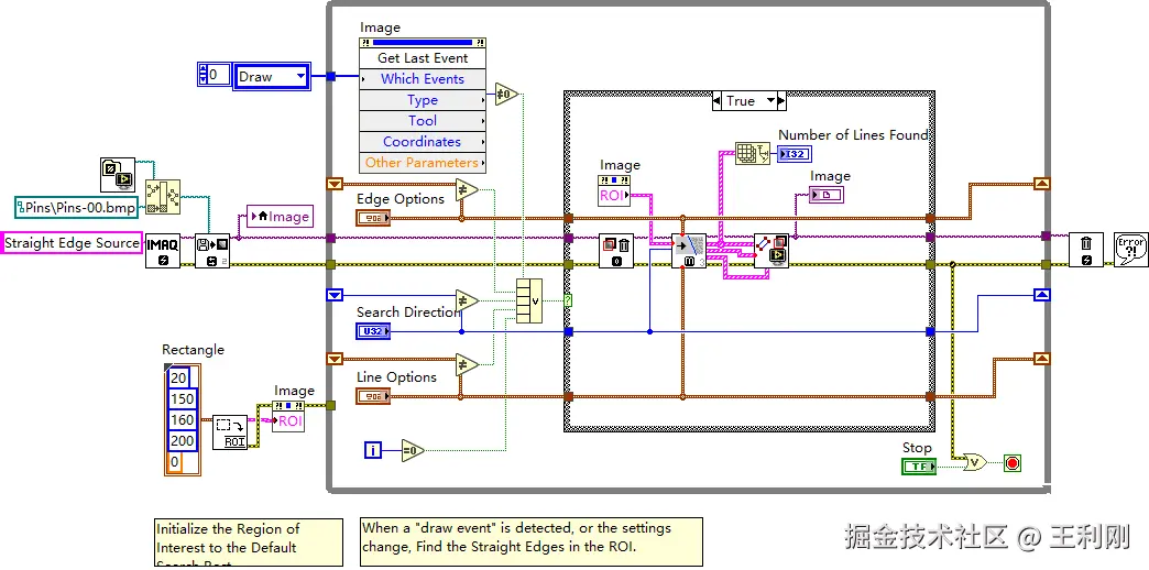本程序基于 NI Vision Development 模块,通过 IMAQ Find Straight Edges 函数,在指定 ROI(感兴趣区域) 内检测多条直线边缘。用户可 动态调整检测参数 或 自定义ROI,实时观察识别效果,适用于 高精度视觉检测 场景。