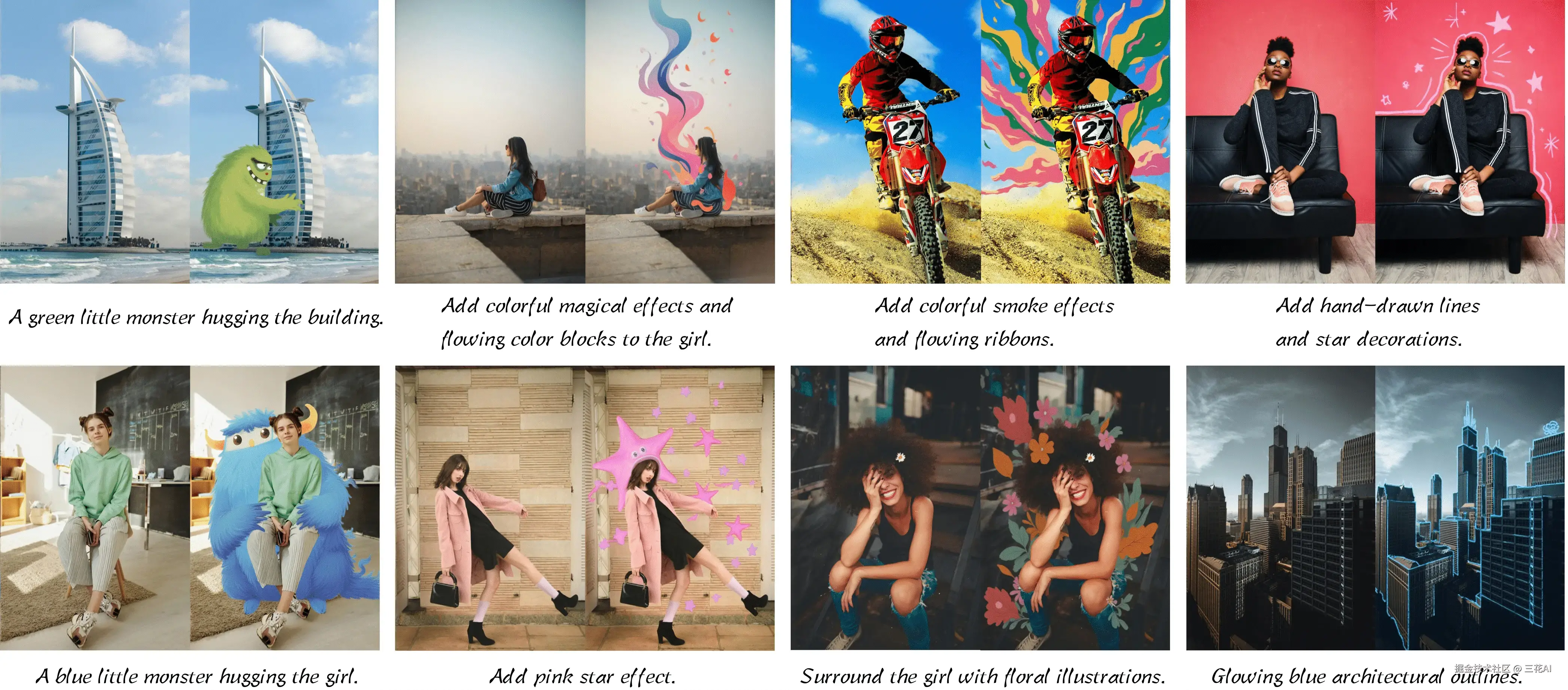 它允许用户通过简单的文字提示,在真实照片中添加艺术化的装饰元素,例如手绘风格的图案、魔幻效果或卡通角色,同时保持原图的真实感。