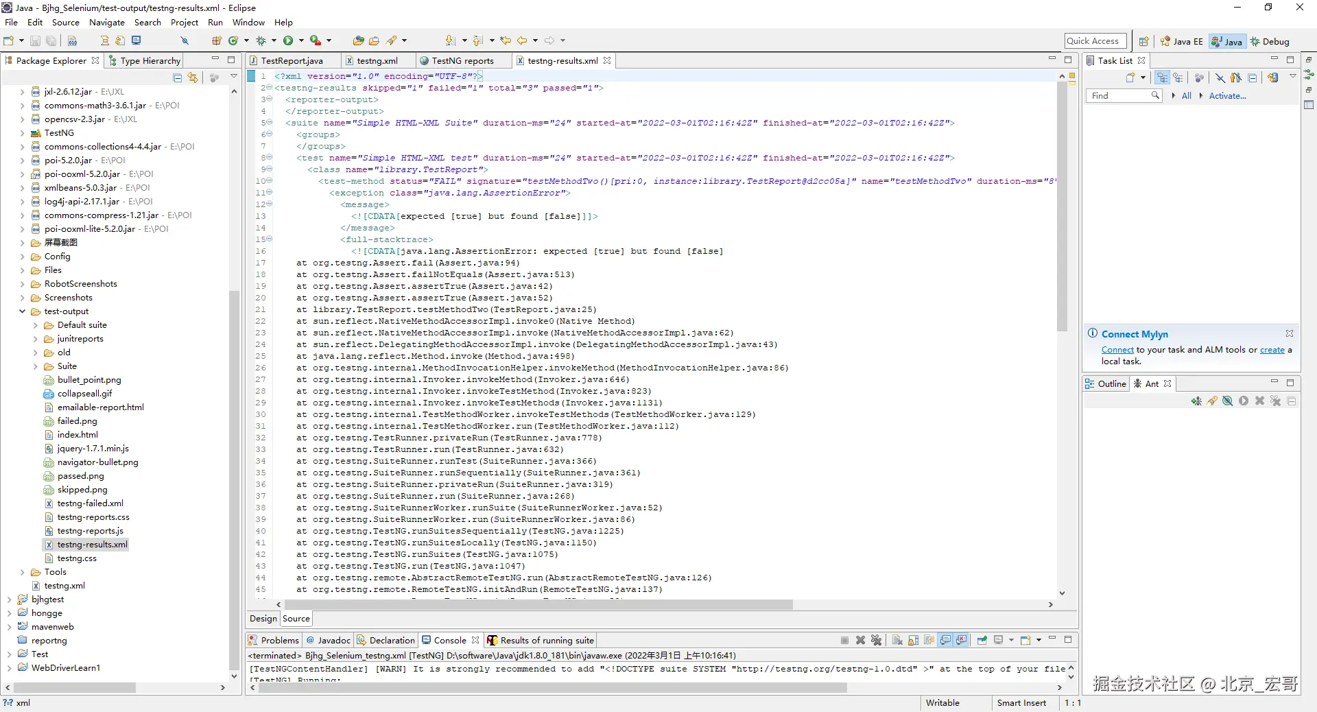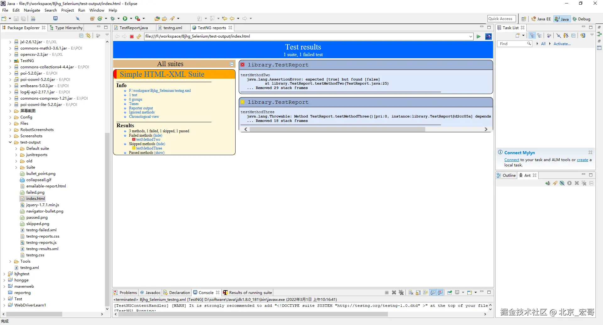 其实前边好像简单的提到过测试报告,宏哥觉得这部分比较重要,就着重讲解和介绍一下。报告是任何测试执行中最重要的部分,因为它可以帮助用户了解测试执行的结果、失败点和失败原因。另一方面,日志记录对于密切关注执行流程或在出现任何故障时进行调试很重要。默认情况下,TestNG 会为其测试执行生成不同类型的报告。这包括一个 HTML 和一个 XML 报告输出。TestNG 还允许其用户编写自己的报告程序并将其与 TestNG 一起使用。还有一个选项可以编写自己的记录器,TestNG 在运行时会通知这些记录器。