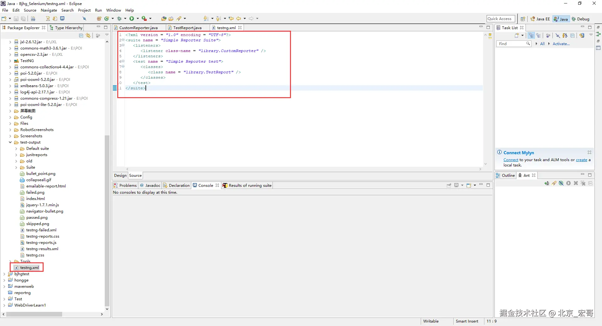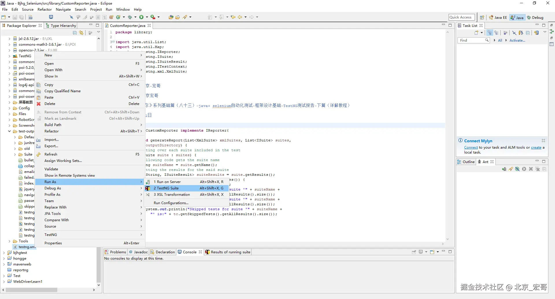 1.在 F:/workspace/Bjhg_Selenium/src/library中创建另一个命名为的新类 CustomReporter.java ,如下图所示: