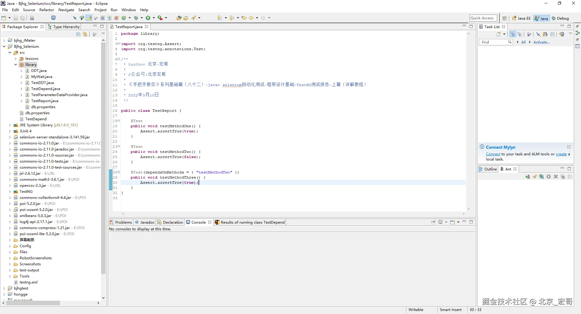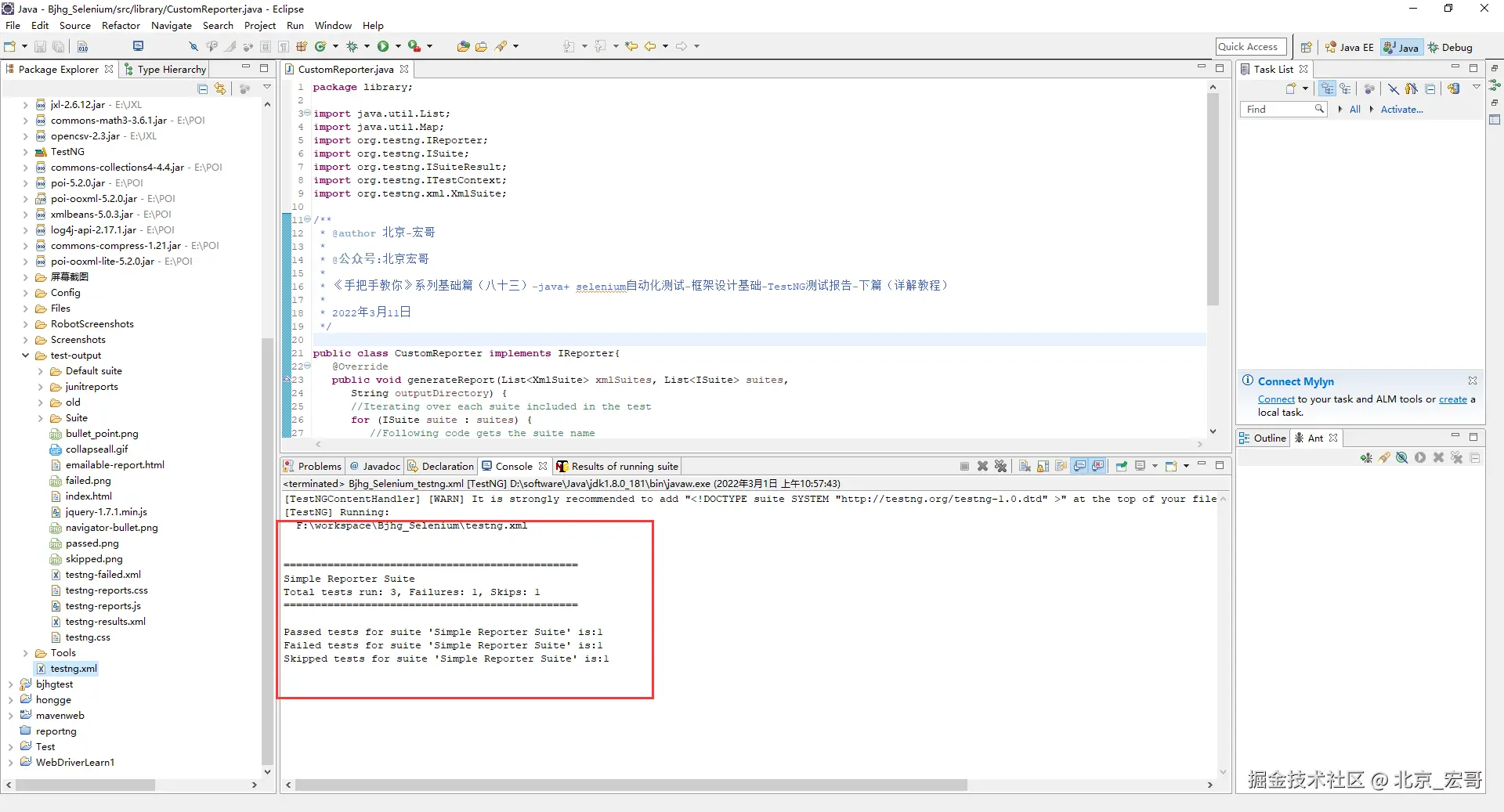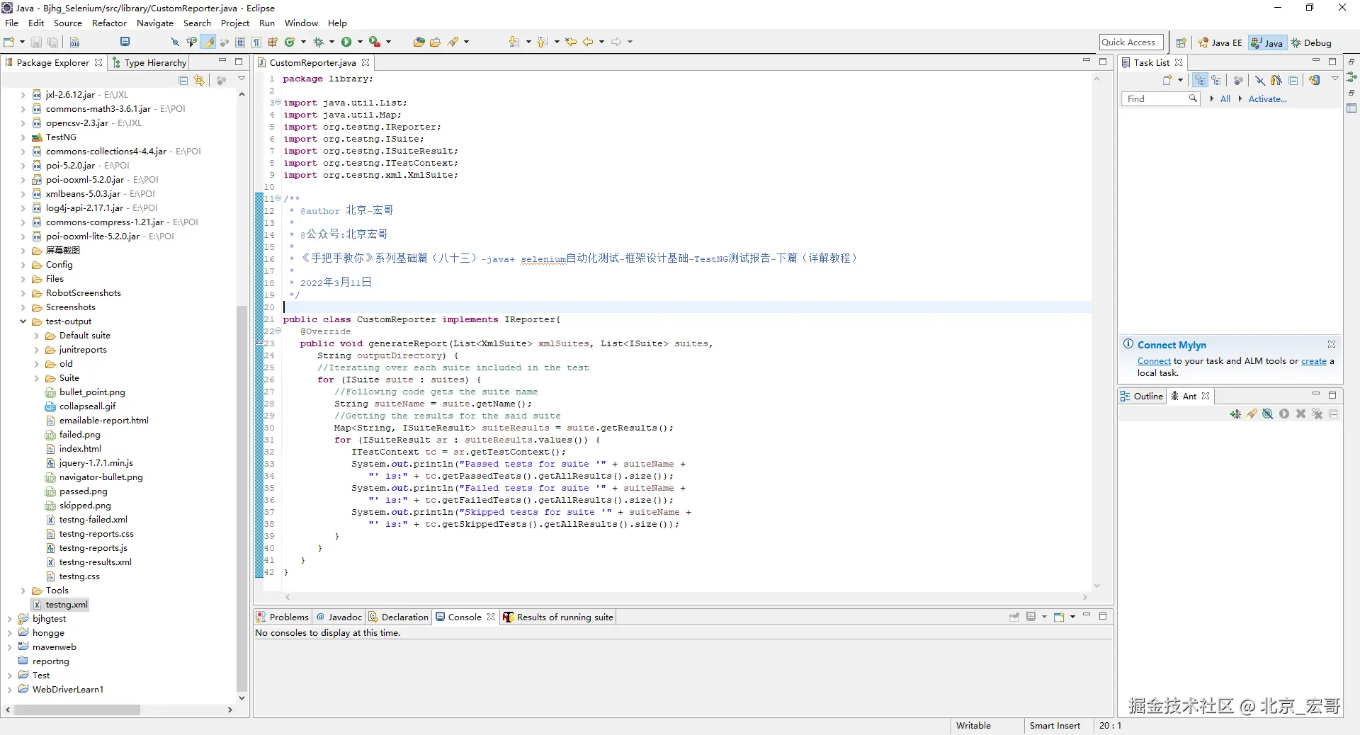 本篇文章宏哥主要是将通过一个示例介绍编写自定义报告器并将其附加到 TestNG 的方法。要编写自定义报告器类,我们的扩展类应该实现 IReporter 接口。让我们继续使用自定义报告器创建一个示例。
