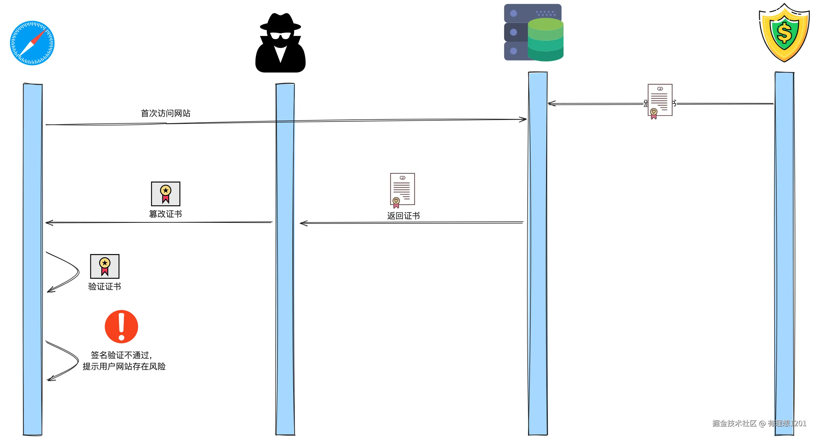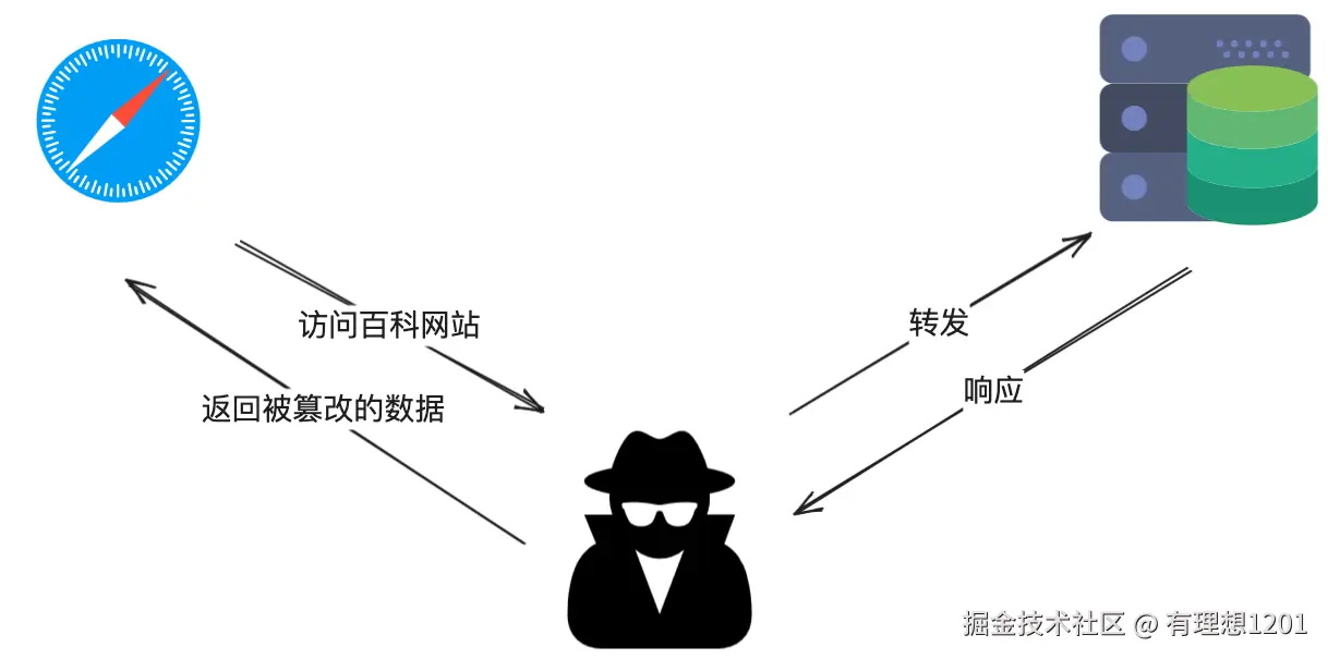 这种攻击是指攻击者劫持了客户端和服务器之间的连接,将服务器的合法证书替换为伪造的证书,并且想办法让用户信任这个假的证书(例如病毒、恶意软件、诱导等等),从而获取客户端和服务器之间传递的信息。这种方式一般容易被用户发现,浏览器会明确的提示证书错误,但某些用户安全意识不强,可能会点击继续浏览,从而达到攻击目的。