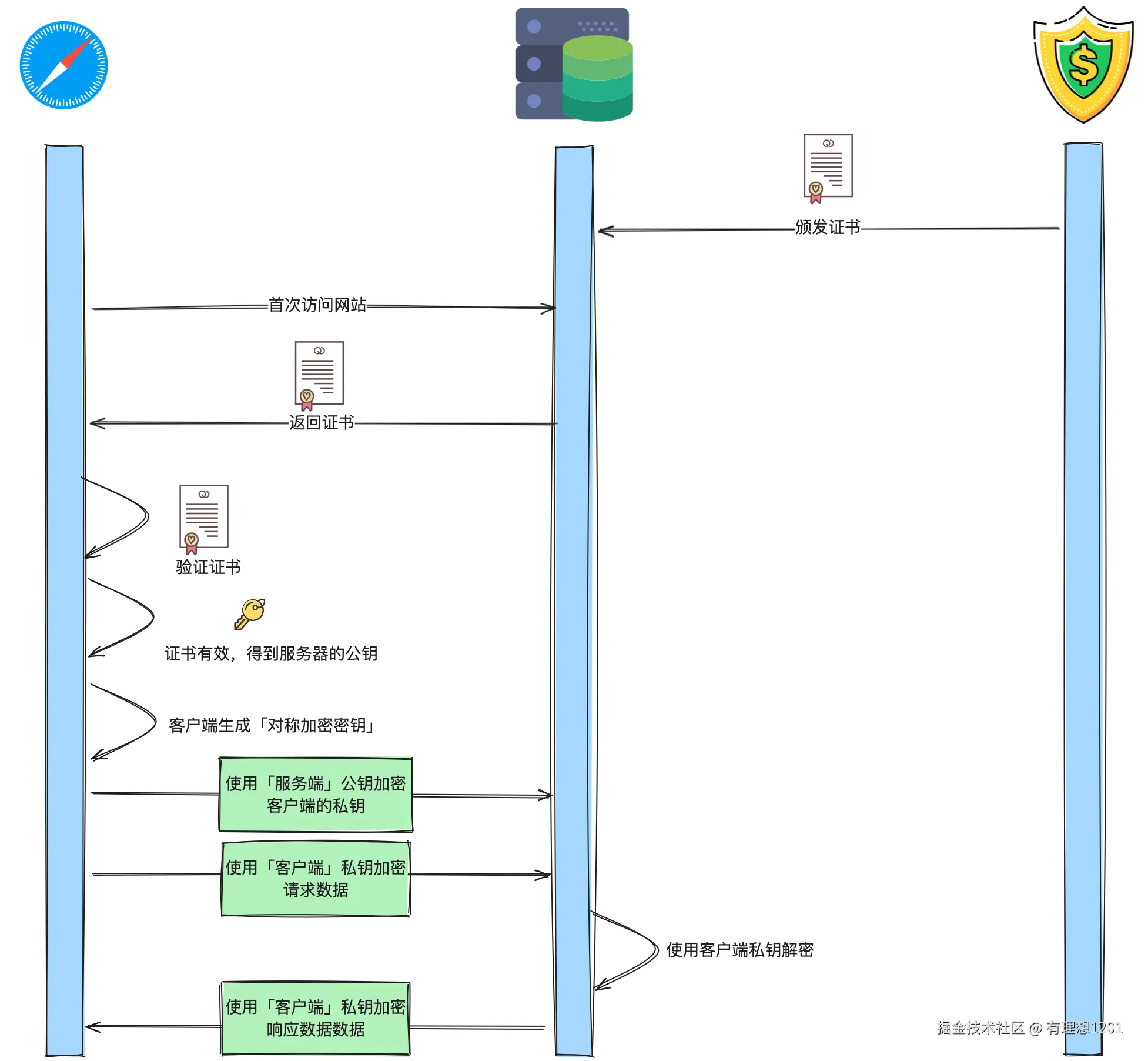 - 服务器返回其数字证书(由 CA 签发)。
