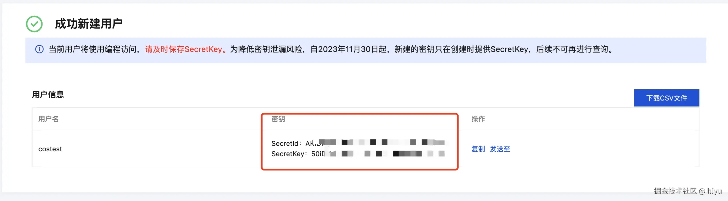 创建完成即可获取密钥,其中SecretKey只会出现一次,请妥善保管密钥。
