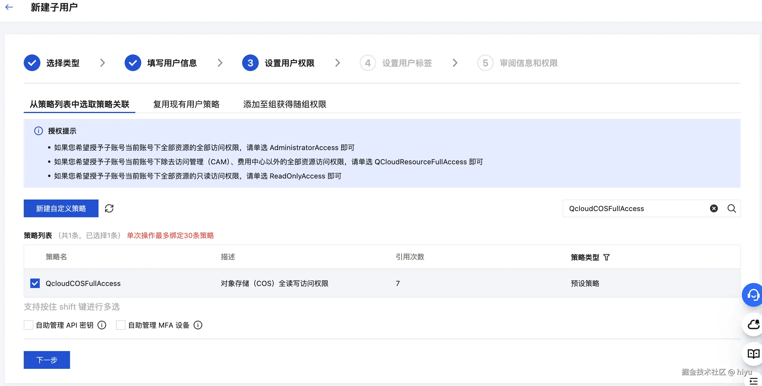 本文选择了给予全读写权限(QcloudCOSFullAccess),若您需要更精细化的权限策略,请选择自定义策略使用三段式