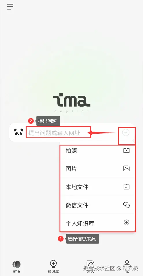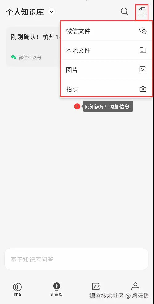 点击右边的+号按钮 =》 选择对应选项(拍照、图片、本地文件、微信文件、个人知识库) =》 填写问题