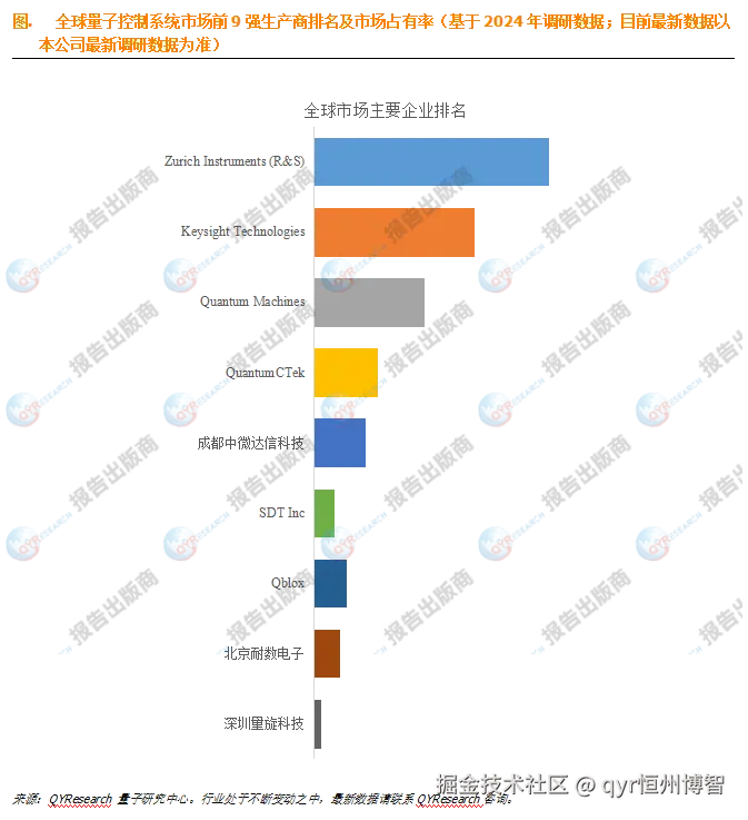 全球范围内,量子控制系统主要生产商包括Zurich Instruments (R&S)、Keysight Technologies、Quantum Machines、QuantumCTek、成都中微达信科技、SDT Inc等,其中前五大厂商占有大约82%的市场份额。