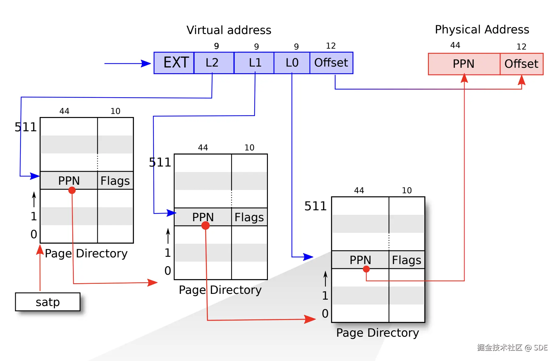 RISC-V CPU 将 虚拟地址 转换为 物理地址 的时,使用了一个类似B+树+字典树的三层树结构来存储页表。