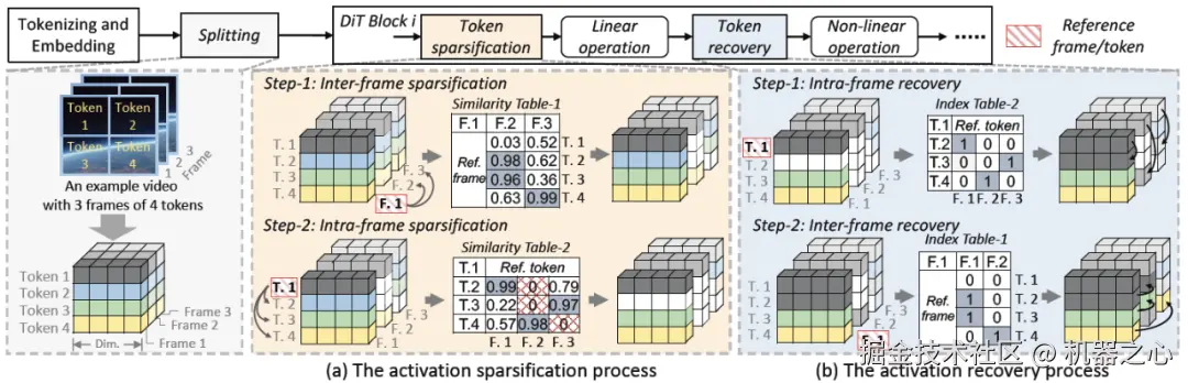 我们提出了一种 “时间 - 空间” 激活值在线稀疏化方法,同时考虑了帧间和帧内的相似性。激活稀疏化的核心思想是:如果两个 token 之间具有高度相似性,则可以只计算其中一个 token,并将结果共享给另一个 token。具体来说,输入激活是一个 3 维张量,由 tokenizer 从噪声视频中处理得到。因此,输入激活可以表示为,其中 F 表示帧数,T 表示每帧的 token 数,d 表示隐藏维度。为了简便起见,我们用 (
