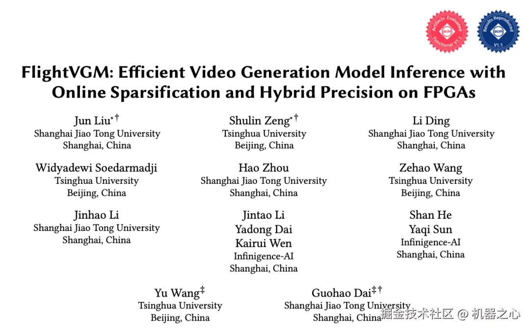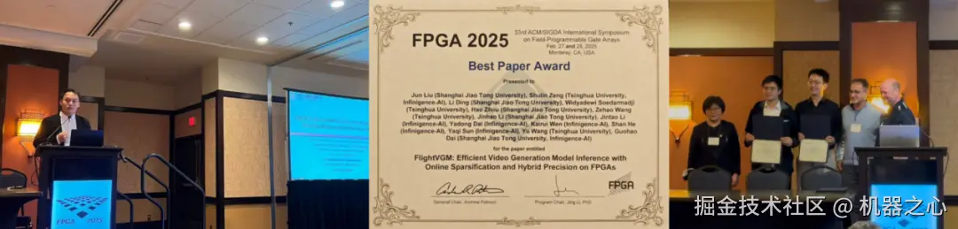国际可重构计算领域顶级会议 ——FPGA 2025 在落幕之时传来消息,今年的最佳论文颁发给了无问芯穹和上交、清华共同提出的视频生成大模型推理 IP 工作 FlightVGM,这是 FPGA 会议首次将该奖项授予完全由中国大陆科研团队主导的研究工作,同时也是亚太国家团队首次获此殊荣。