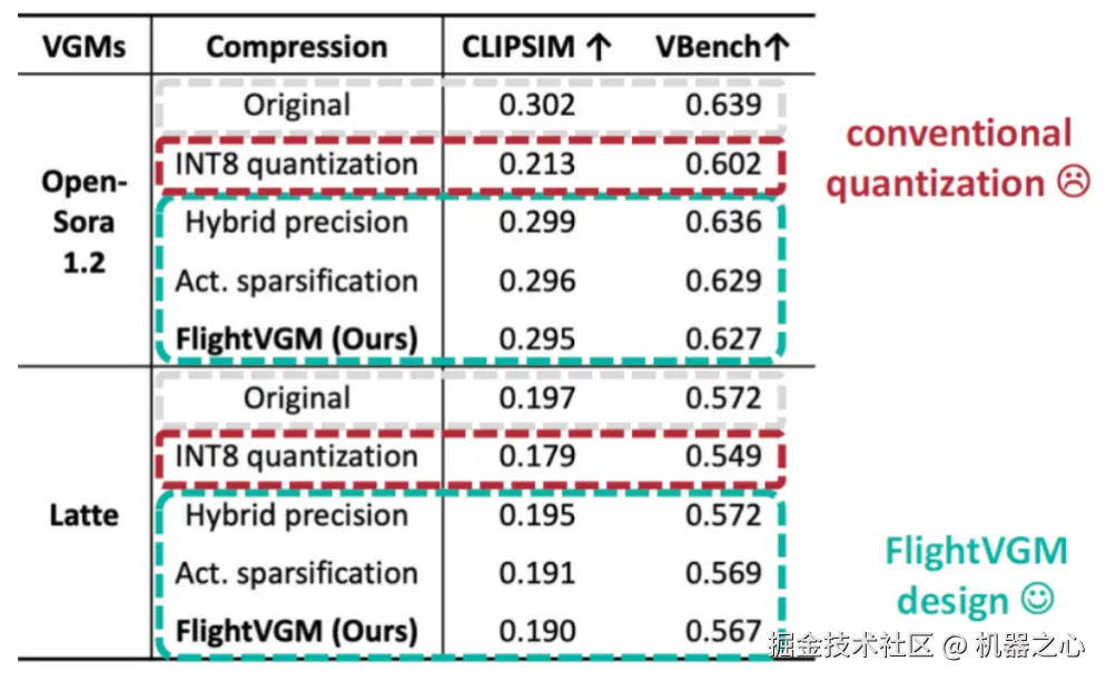 与基准模型相比,FlightVGM 对于模型精度的影响几乎可以忽略(仅平均损失为 0.008),而使用全 INT8 量化时,平均损失为 0.042。同时,在实际视频生成效果上,FlightVGM 生成的视频与原始模型仍有较好的保持。