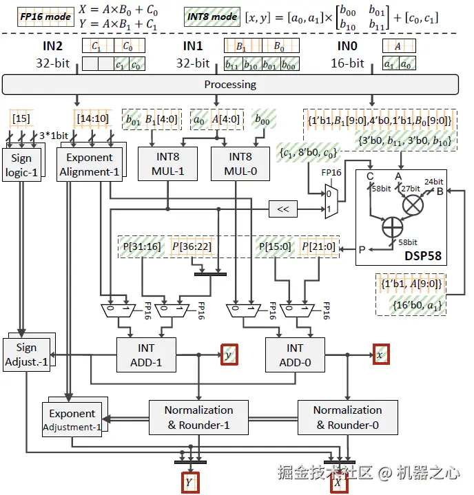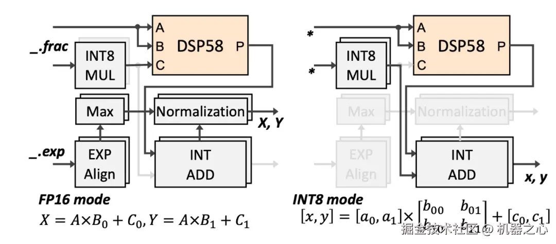 为了解决这一问题,我们提出了基于 DSP58 的创新性 FP16-INT8 混合精度硬件架构 ——DSP-Expansion (DSP-E)。该架构允许在运行时配置,支持两个 FP16 乘加单元(MAC)或四个 INT8 乘加单元。我们的核心思路是通过引入额外的乘法器来解决当一个 DSP58 执行两个 FP16 分数乘法时的数据混淆问题,这些乘法器在 INT8 模式下也可以复用。在 FP16 模式下,DSP58 执行两个 MAC 的分数乘法,并通过减去 INT8 乘法器的结果来获得正确的中间计算结果。中间结果的指数部分通过 INT 加法器计算,并通过指数对齐和调整单元对齐小数点位置,最终通过加法、归一化和四舍五入得到最终结果。在 INT8 模式下,DSP-E 通过复用 DSP58、两个 INT8 乘法器和两个 INT 加法器,最大化计算性能。通过将相关数据输入到不同的端口,额外的逻辑单元可以复用硬件资源,从而有效地提高了计算吞吐量。