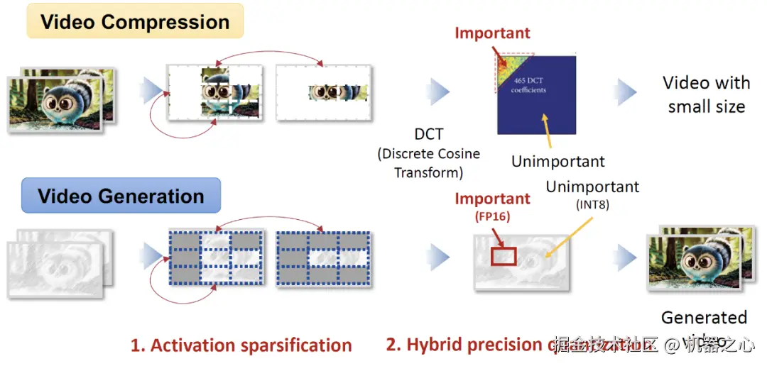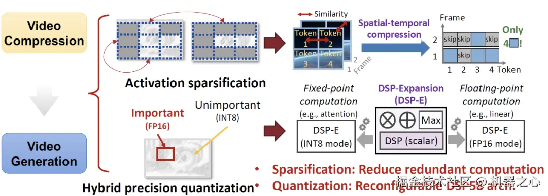 FlightVGM 创新性地将这一思想引入视频生成模型的加速中。视频生成模型(VGMs)在推理过程中同样表现出显著的时空冗余性。例如,相邻帧之间的 Token 在语义上高度相似,而同一帧内的不同区域也可能共享相同的视觉特征。然而,现有 GPU 架构无法充分利用这种冗余性。FPGA 虽然具备稀疏计算的优势,但其峰值算力远低于 GPU,且其计算单元(例如 V80 的 DSP58)的传统设计无法动态适配混合精度需求,限制了其在视频生成加速中的应用。FlightVGM 通过以下三项技术,解决上述挑战:
