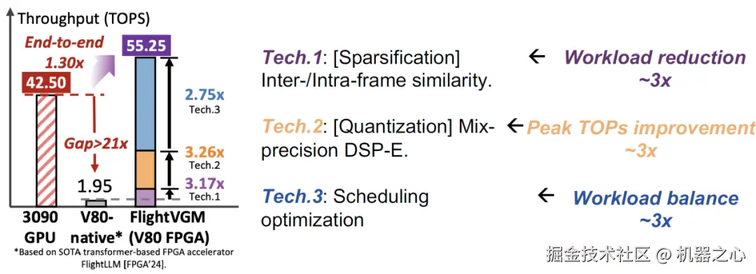 这项工作首次在 FPGA 上实现了视频生成模型(Video Generation Models, VGMs)的高效推理,也是该团队继去年在 FPGA 上加速大语言模型 FlightLLM(FPGA’24)后的最新系列工作。与 NVIDIA 3090 GPU 相比,FlightVGM 在 AMD V80 FPGA 上实现了 1.30 倍的性能提升与 4.49 倍的能效提升(峰值算力差距超过 21 倍)。