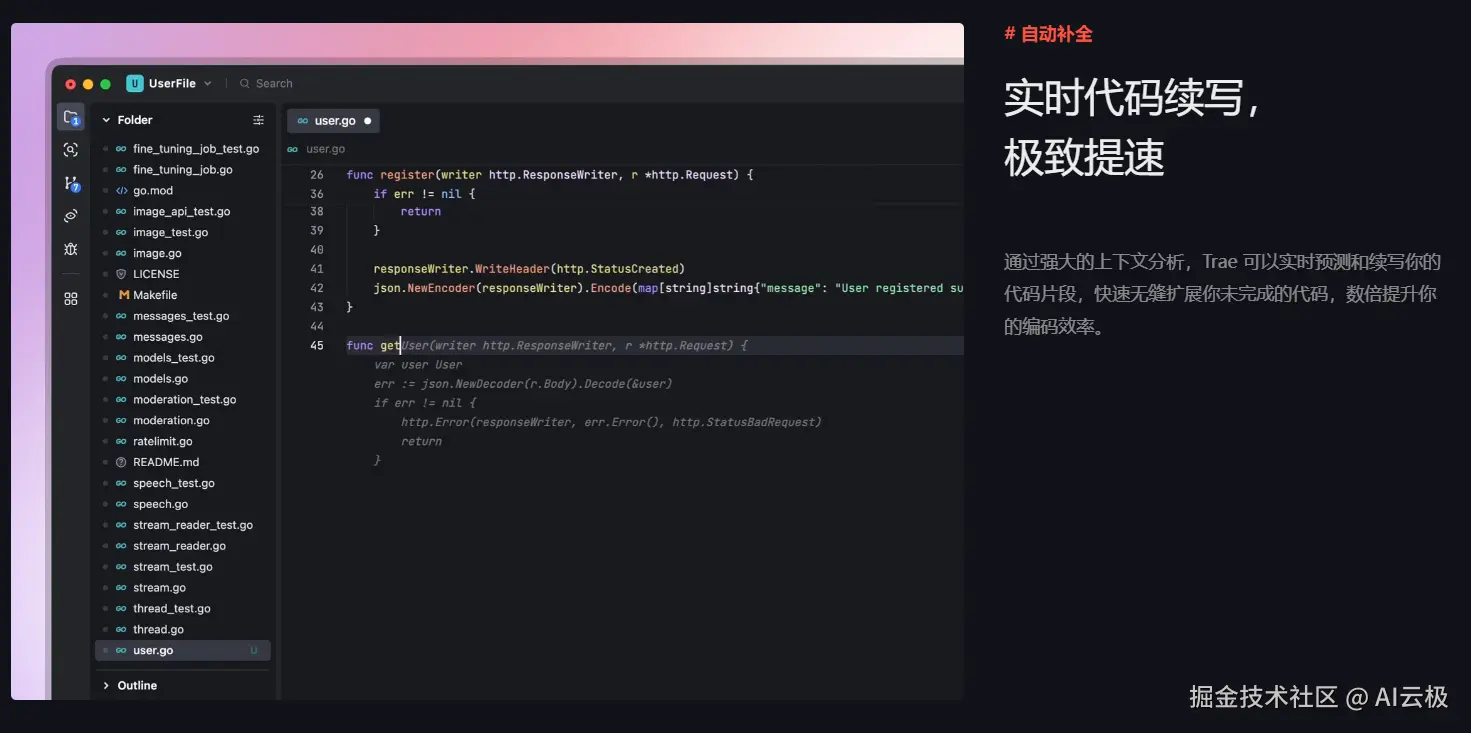 Trae 搭载的 doubao-1.5-pro 和 DeepSeek R1 & V3 模型,可以根据你的上下文,智能补全代码,甚至预测你接下来要写的逻辑。