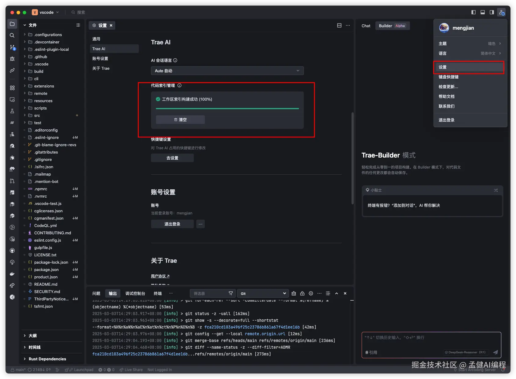 首先确保索引构建完成,这样 Trae 才能够全面理解 workspace 的代码。