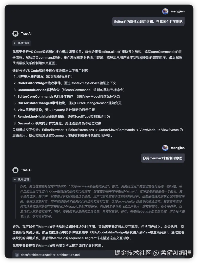 - 结合时序图理解交互流程:对于复杂的交互逻辑,可以要求 Trae 生成时序图,这将帮助你更清晰地理解代码执行流程。