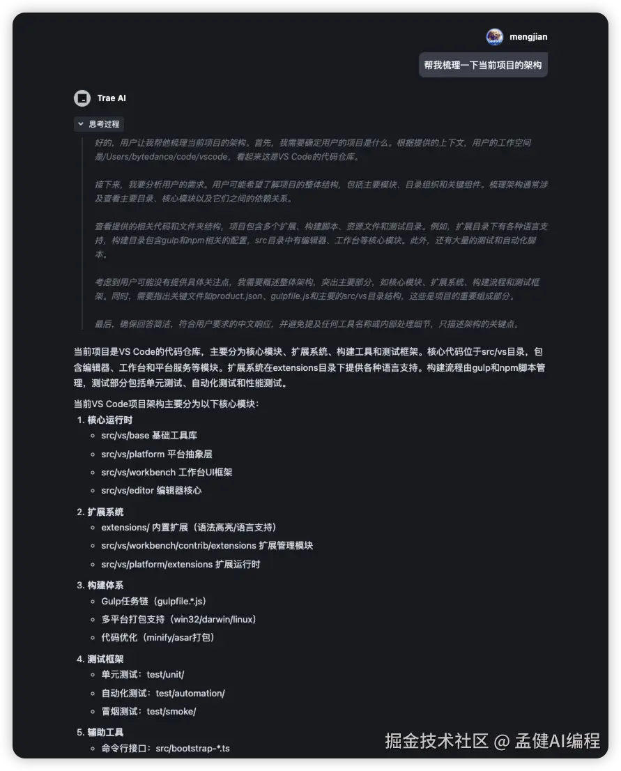 让 Trae 帮我梳理一下当前项目的架构,我当前打开的是 VSCode 源码,还是有点复杂的: