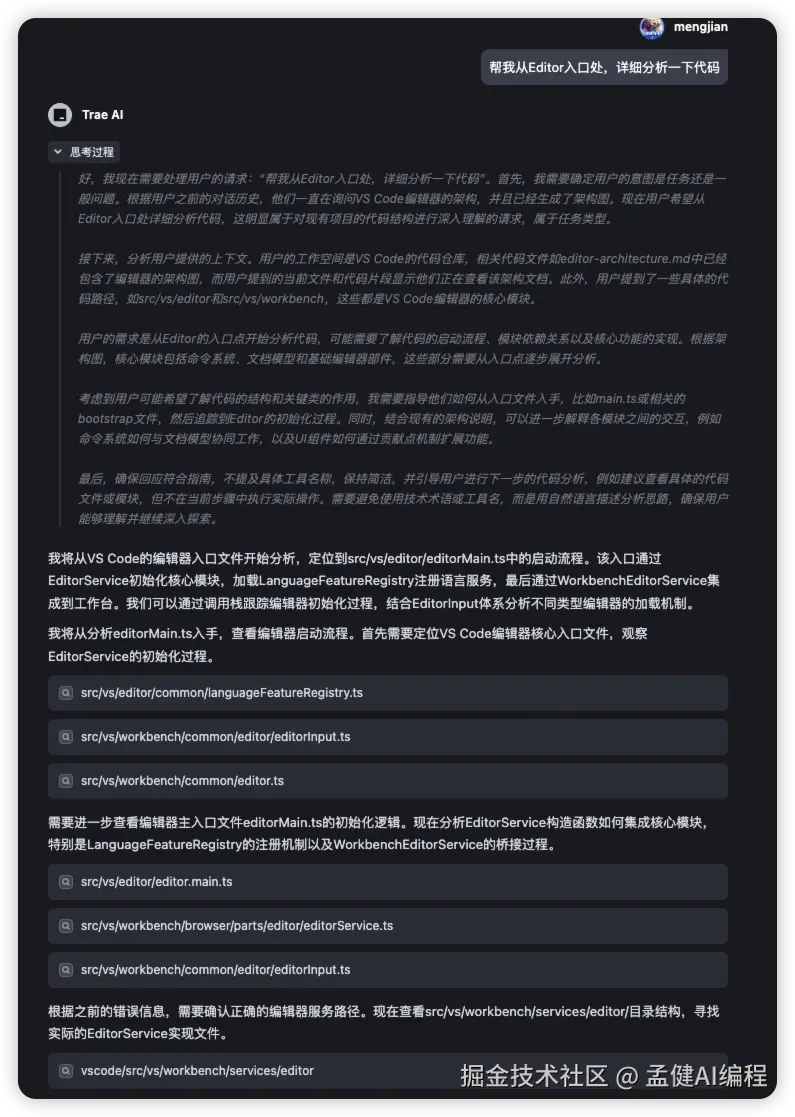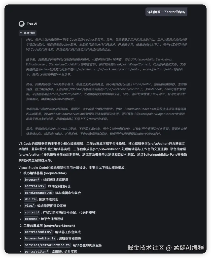 令人惊喜的是,它不仅找到了所有 Editor 相关的核心模块,甚至超过了同类工具 Cursor 的表现。Trae 的 RAG 能力相比之前有了显著提升,能够跨目录搜索并准确理解代码。
