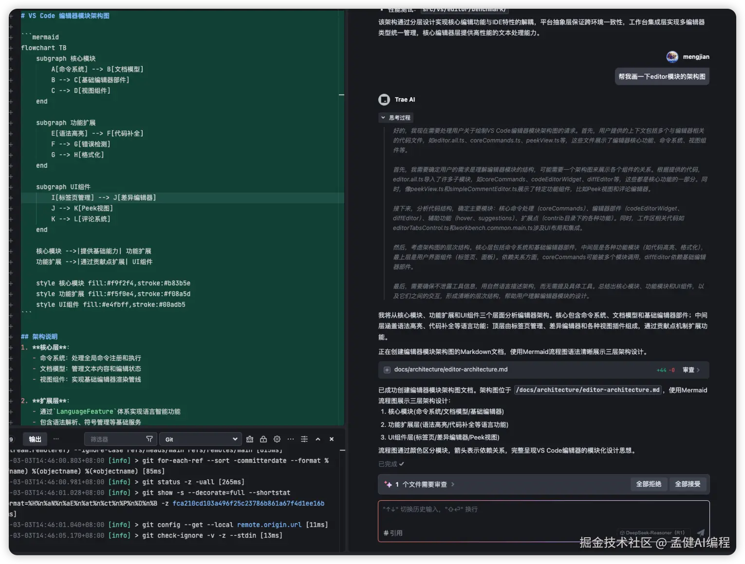 接下来让它画一下 Editor 的架构图,它直接生成了一个 markdown 文件,放在了 docs/architecture 目录下: