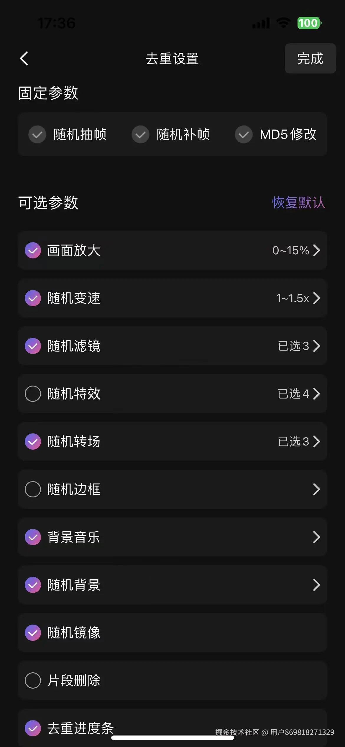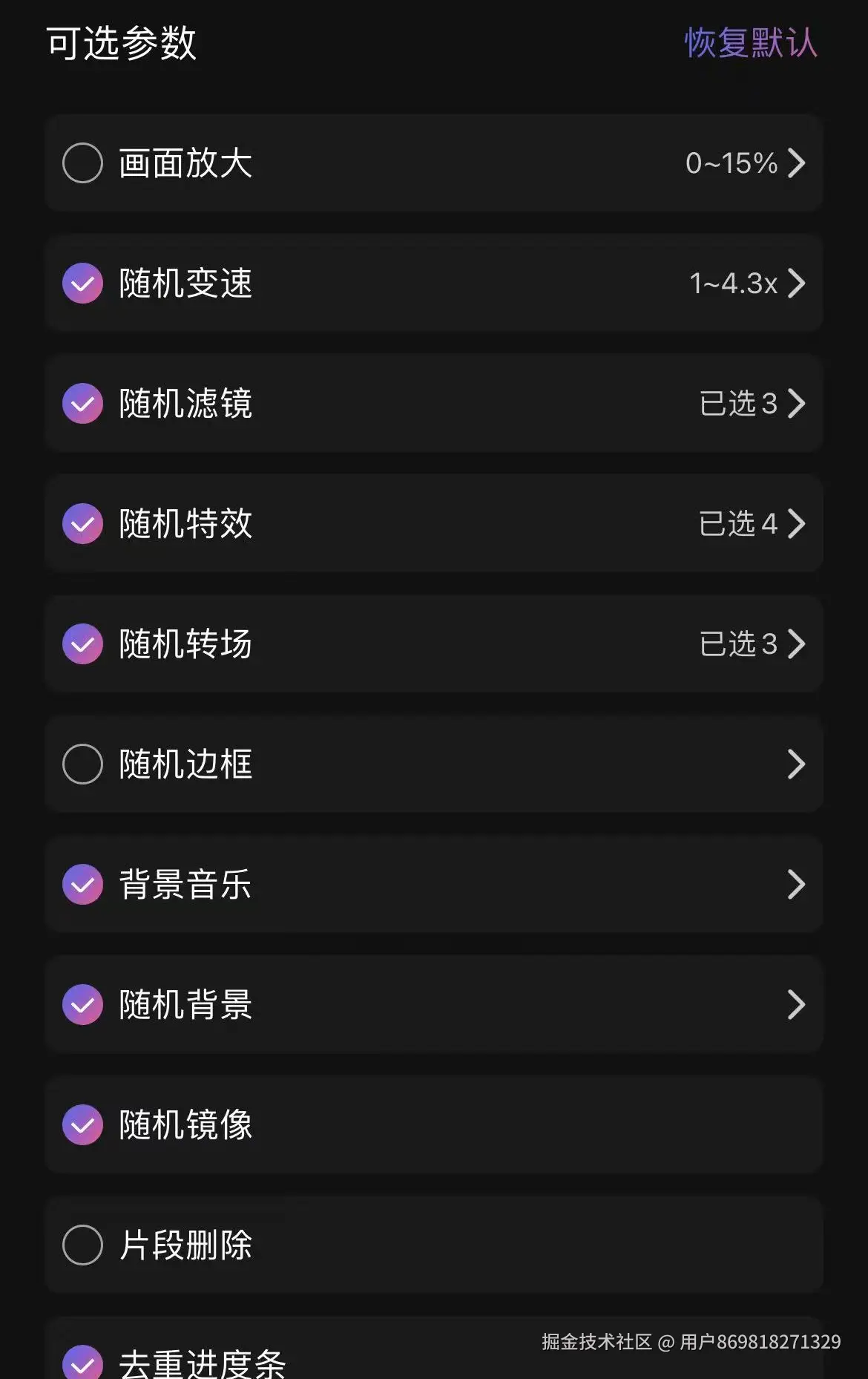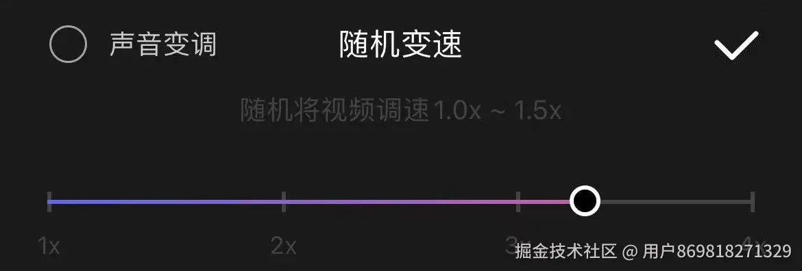 2.随机变速:随机变速功能可以让视频在播放过程中随机改变速度,默认在1x-1.5x内随机,为视频增添更多趣味性和节奏感,每一次变速都能生成一个风格独特的原创视频。
