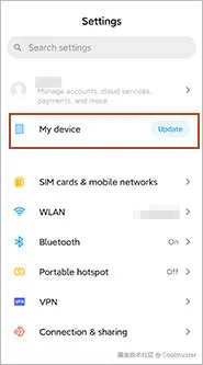 如果您的版本已过时,您可以通过“设置”应用更新手机。对于Android用户,打开 “设置” > “我的设备” 并检查更新。根据Android手机型号,显示会略有不同。