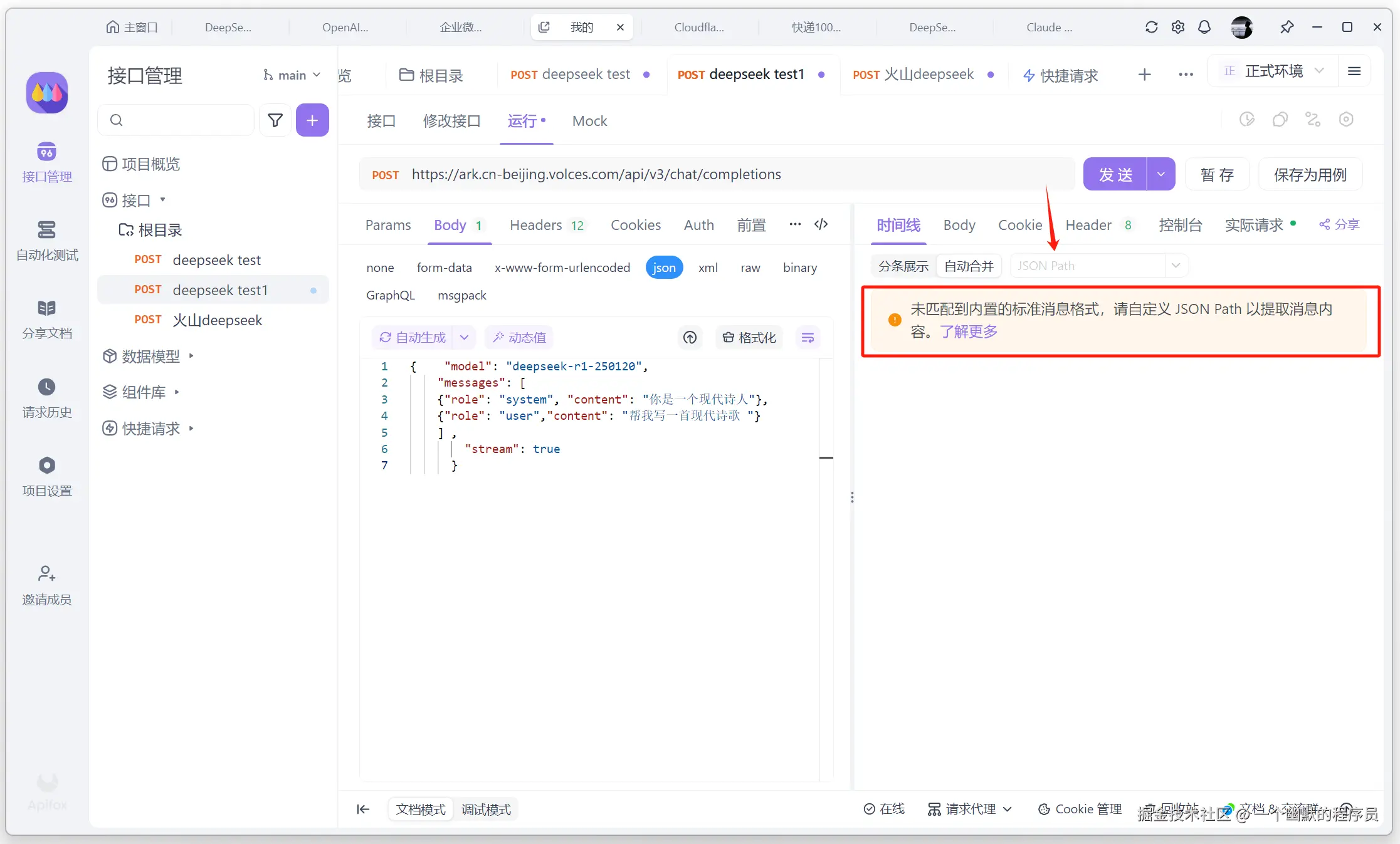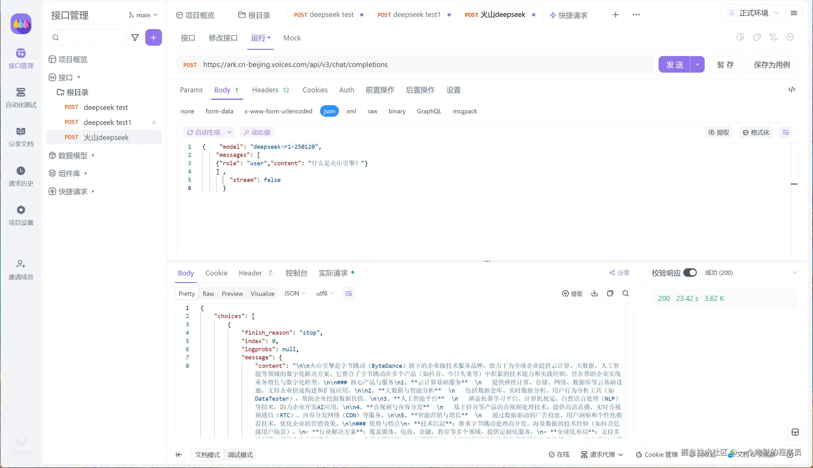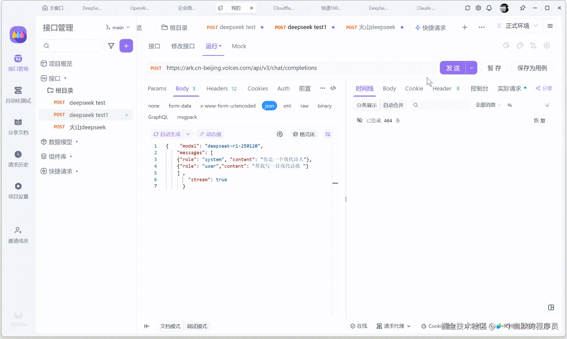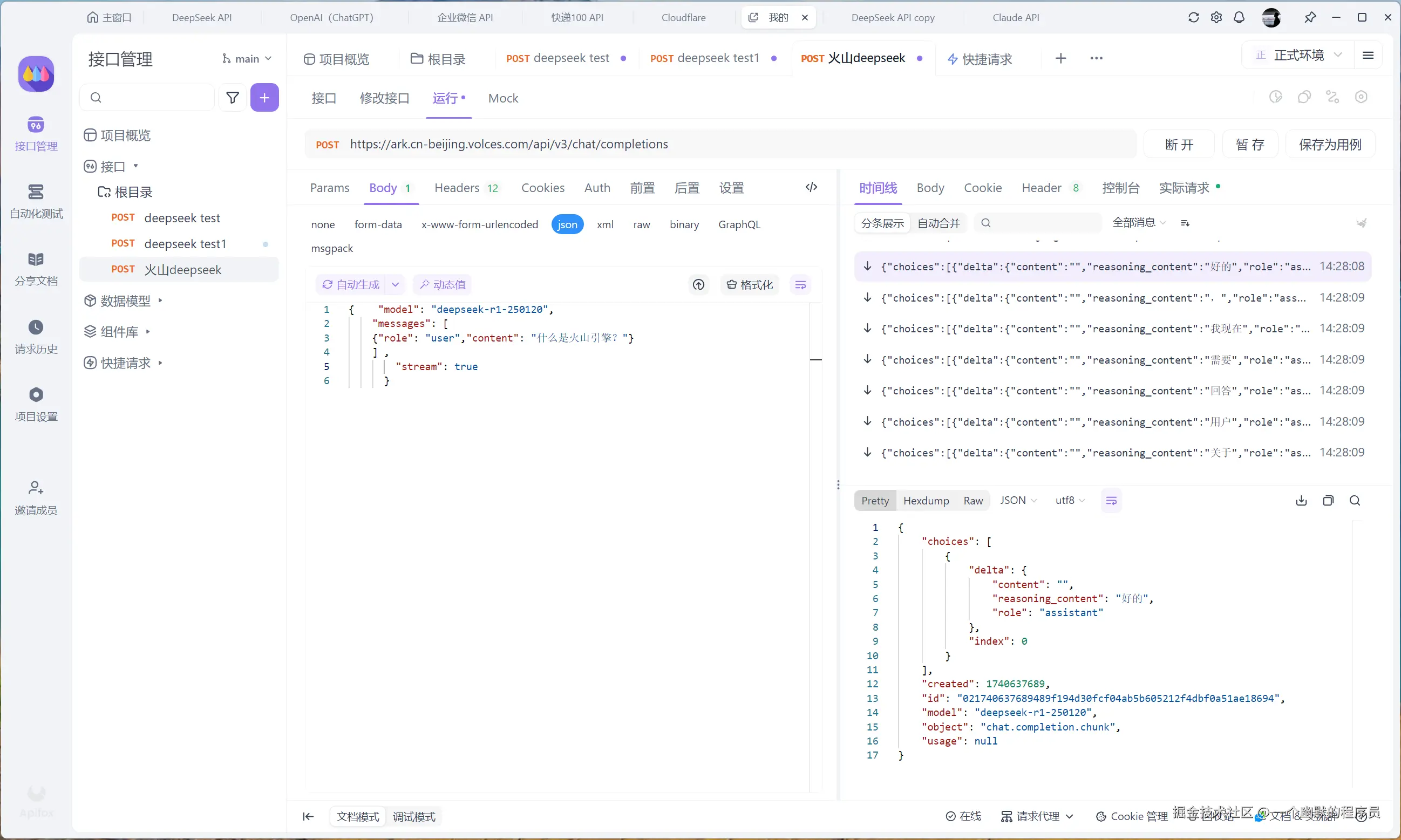 火山引擎的 Deepseek 是最丝滑的,配合 Apifox 增强的 SSE 功能,更加高效地调试 AI 接口,同时直观地展示模型推理的过程,现在就去试试吧!