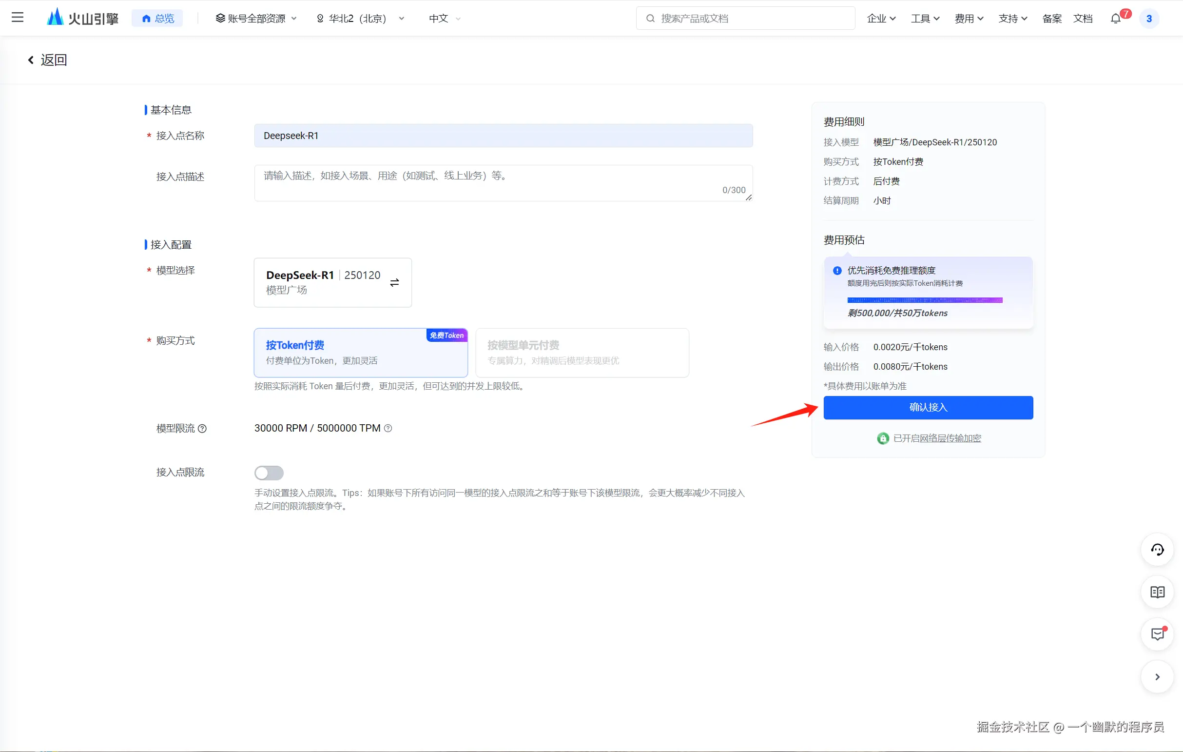 按Token付费,点击确认接入。