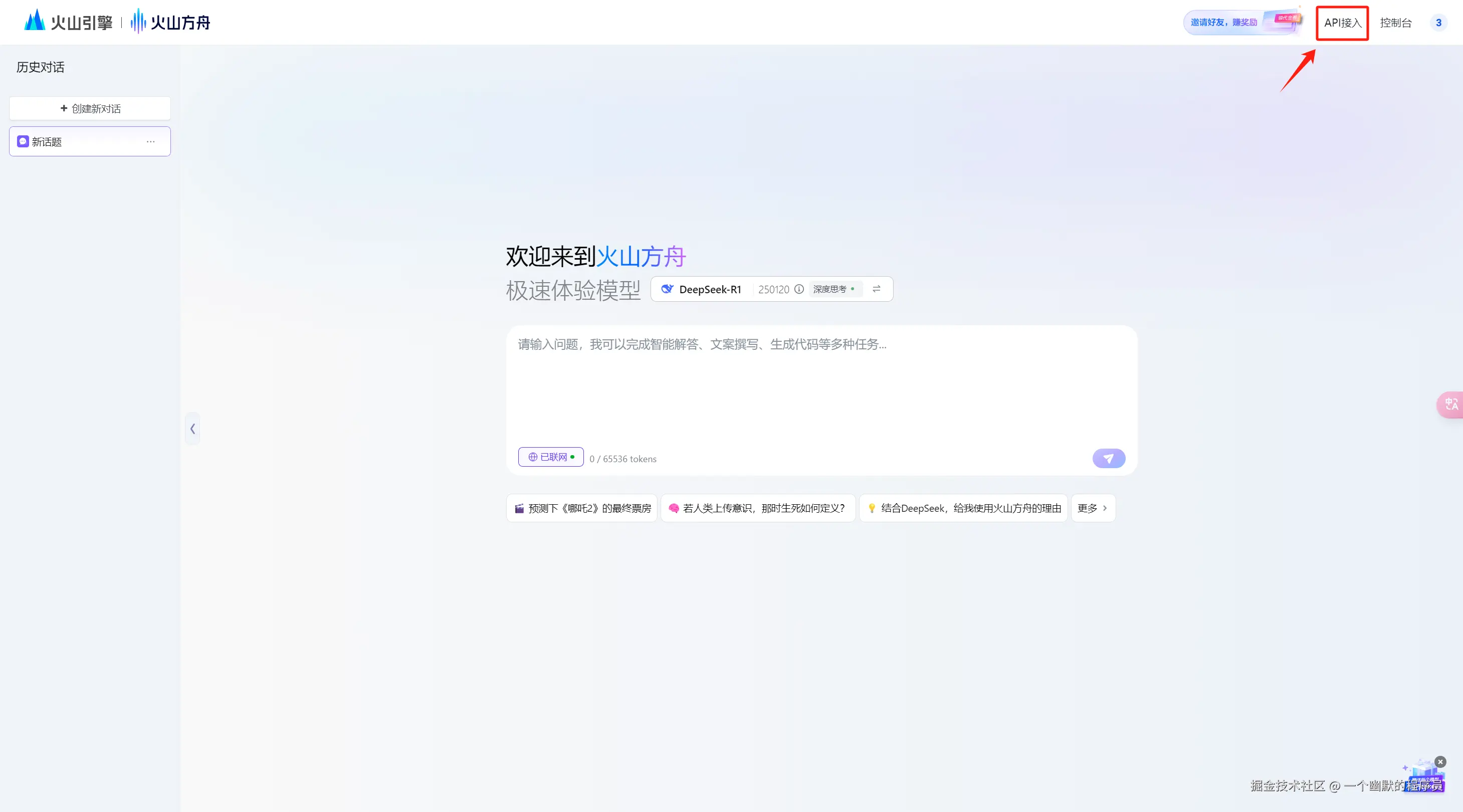 因为火山引擎出手了!就算 Deepseek 官网消失了也不影响你我用满血联网 Deepseek-R1!。火山引擎的 Deepseek 是最丝滑的,比 DeepSeek 爆火前还丝滑,当时调用一次 api 大概 11~13 秒左右。话不多说,上教程,50 万 tokens 免费领。