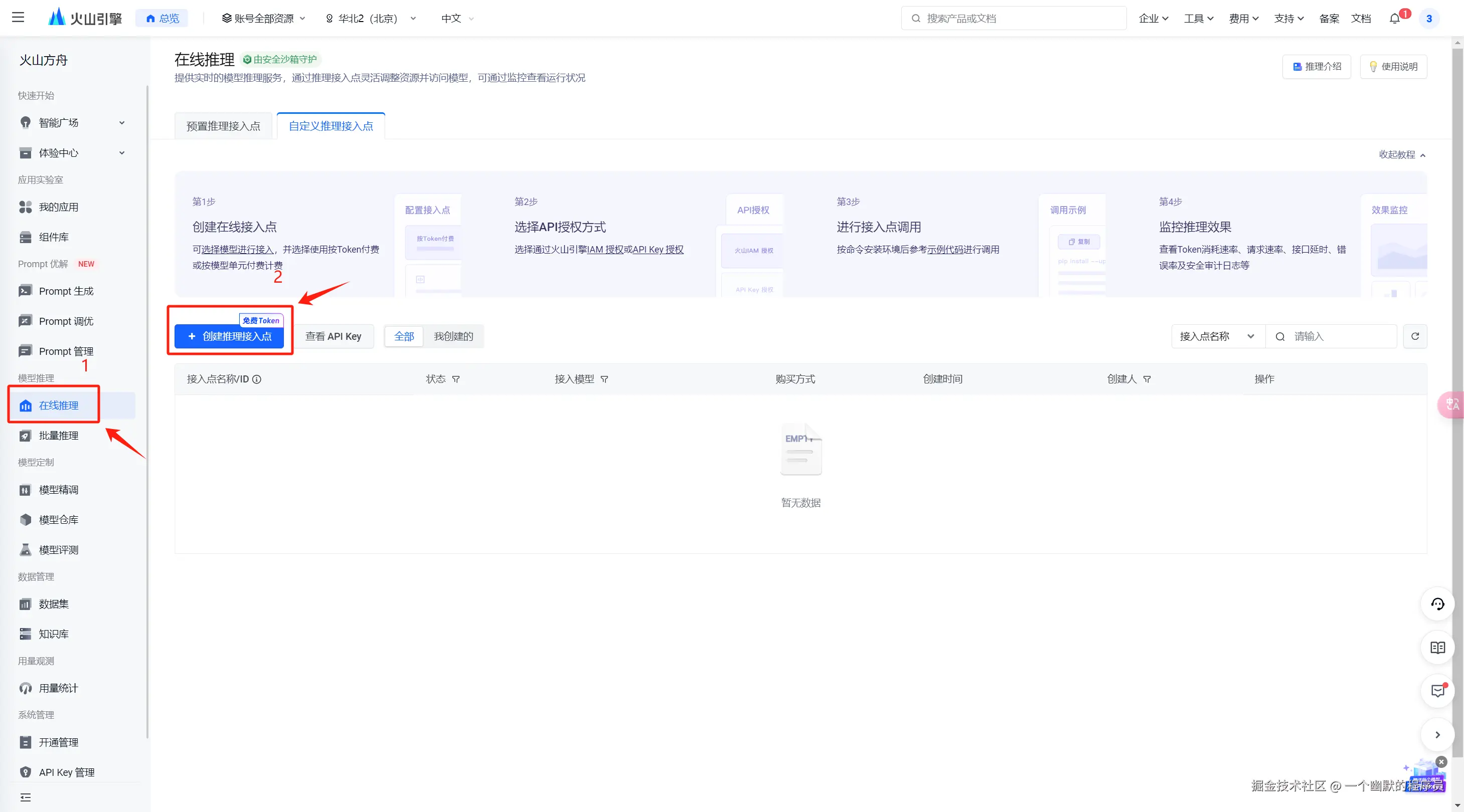 在线推理,接着点击创建推理接入点。