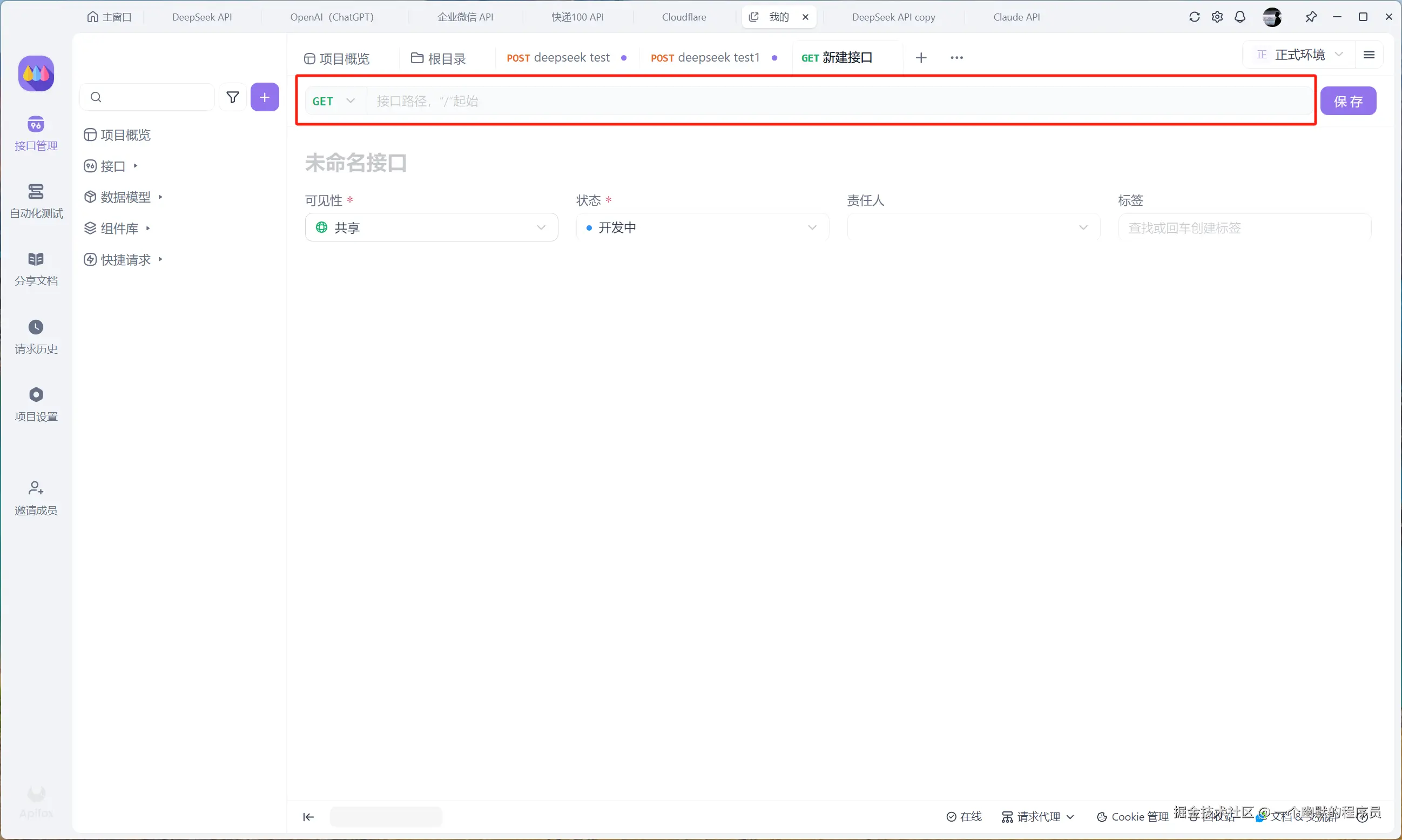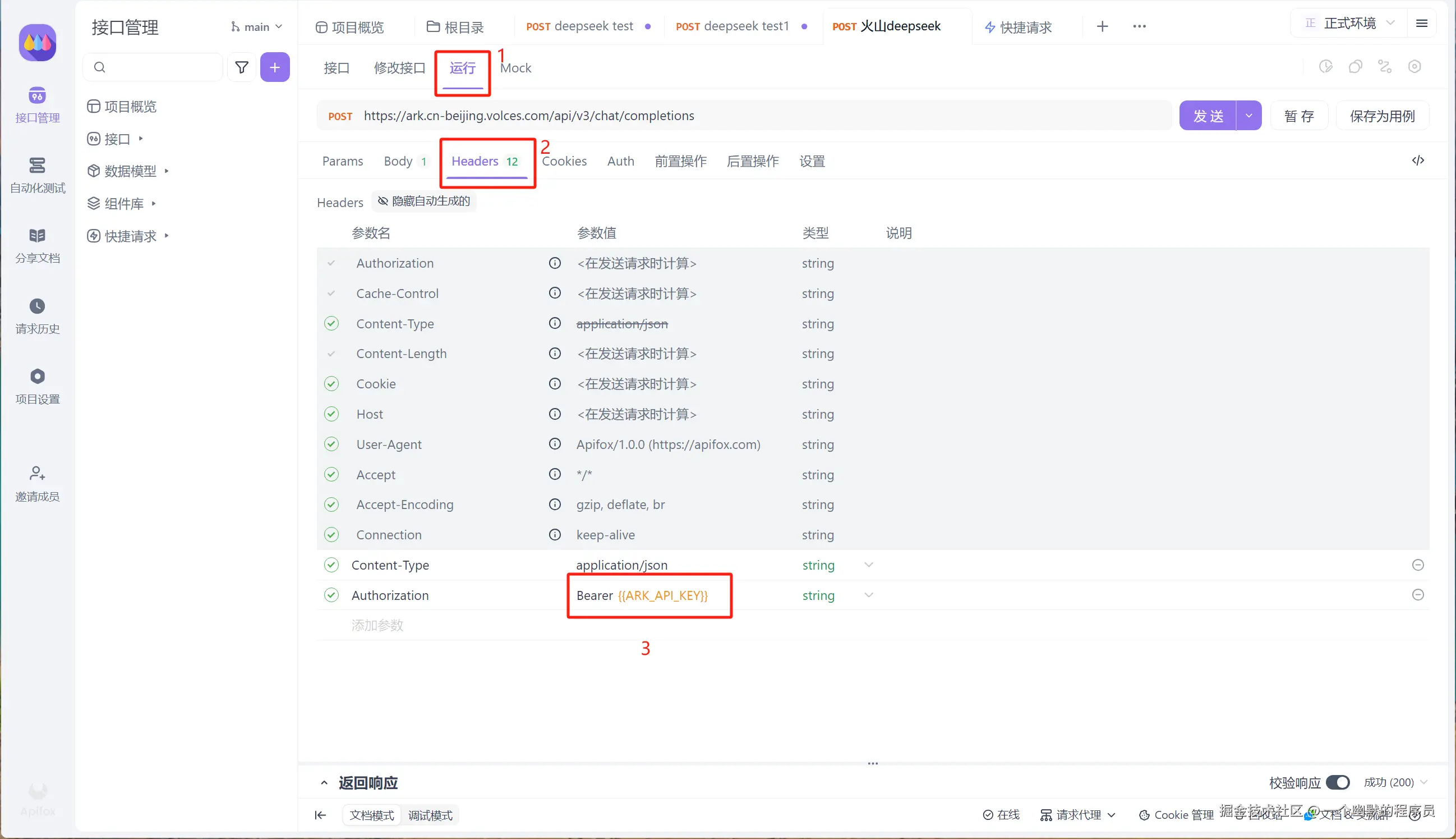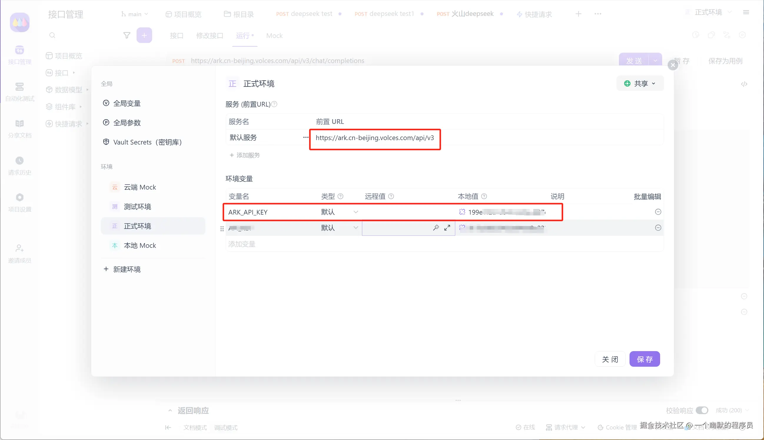 然后在项目右上角的 “环境管理” 中,点击“正式环境”,在服务前置 URL 那里填写 [https://ark.cn-beijing.volces.com/api/v3](https://ark.cn-beijing.volces.com/api/v3),然后添加一个环境变量,可以将其命名为 ARK_API_KEY,这个环境变量的值就是上面创建的 Deepseek API 的 API Key,添加完成后保存即可。这样在发送请求的时候才会携带存储在环境变量中的 ARK_API_KEY。
