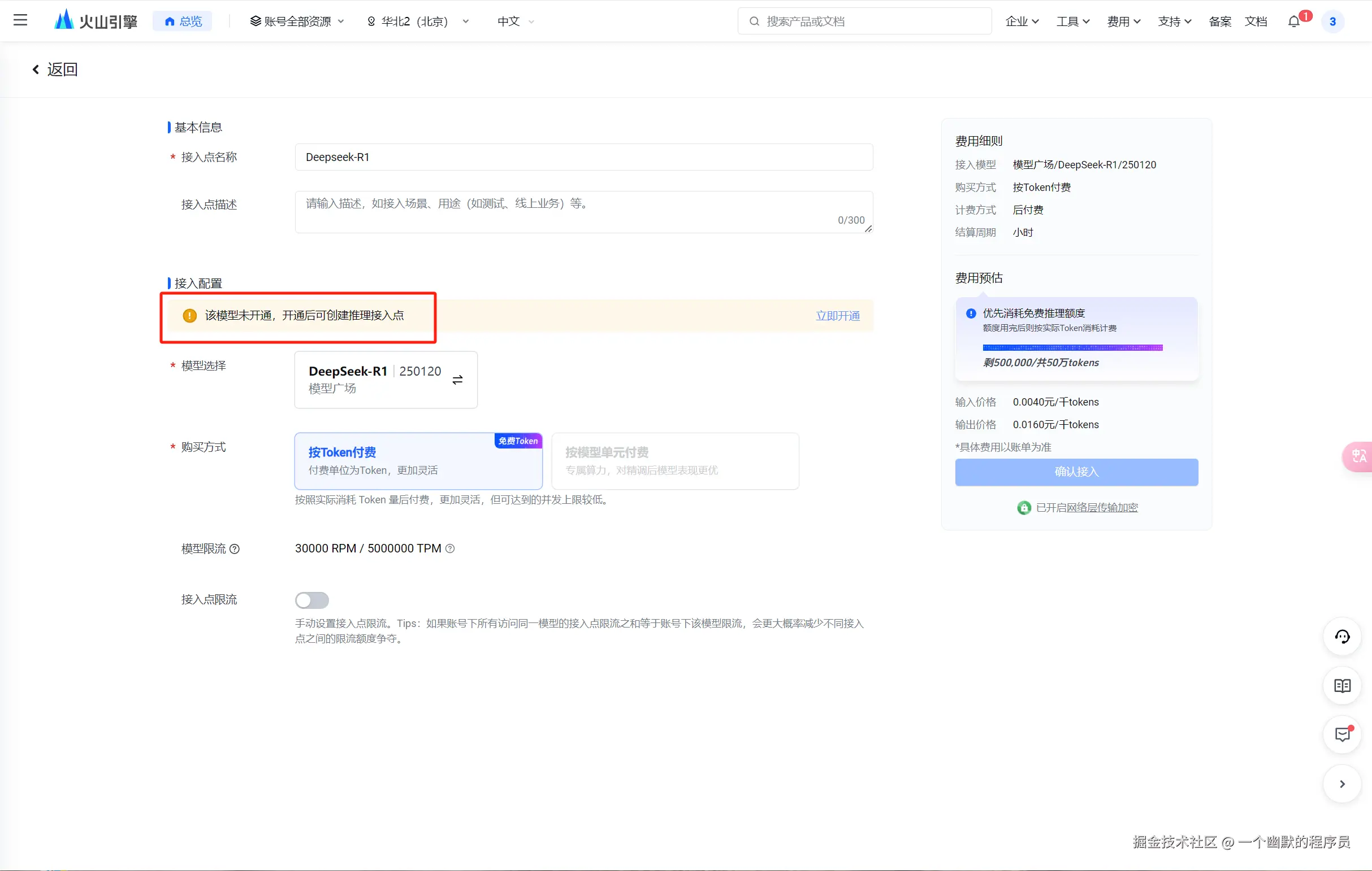 - 接入配置显示模型未开通,点击立即开通。