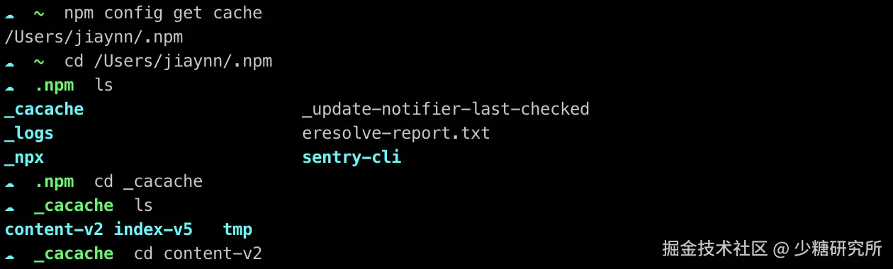 - 生成缓存唯一标识:接着,在每次安装资源时,根据 package-lock.json 中存储的 integrity、version、name 信息生成一个唯一的 key,这个 key 能够对应到 index-v5 目录下的缓存记录。