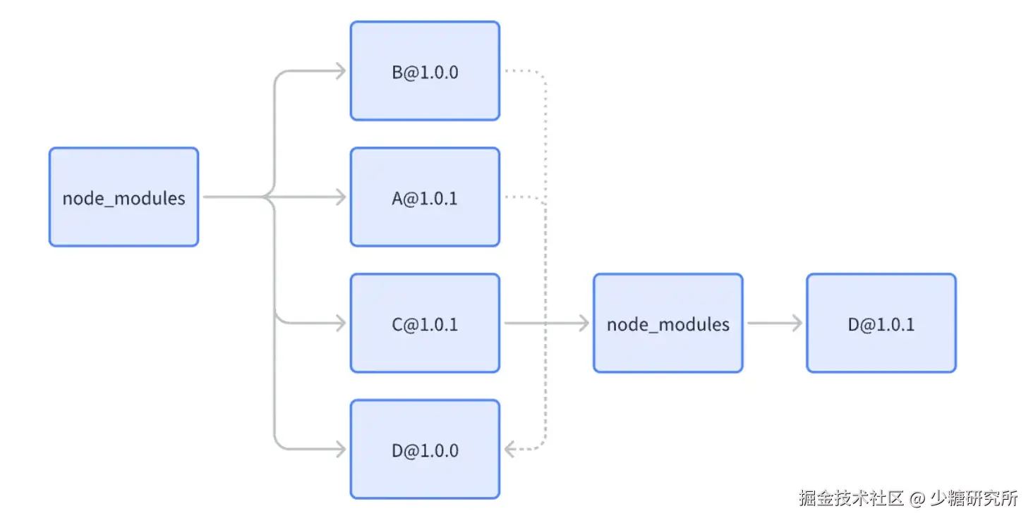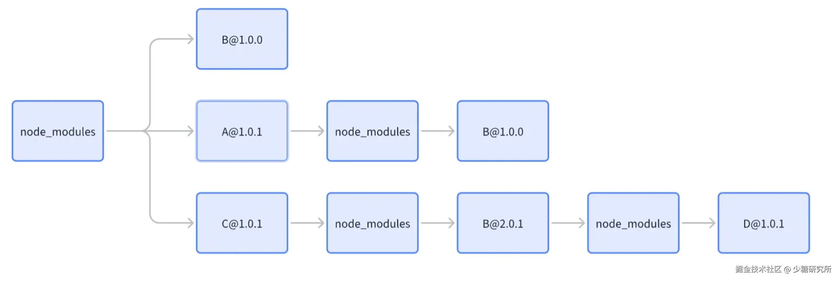 可以看到还是会有一定可能产生嵌套问题,因为根目录只能存放某个包的一个版本。