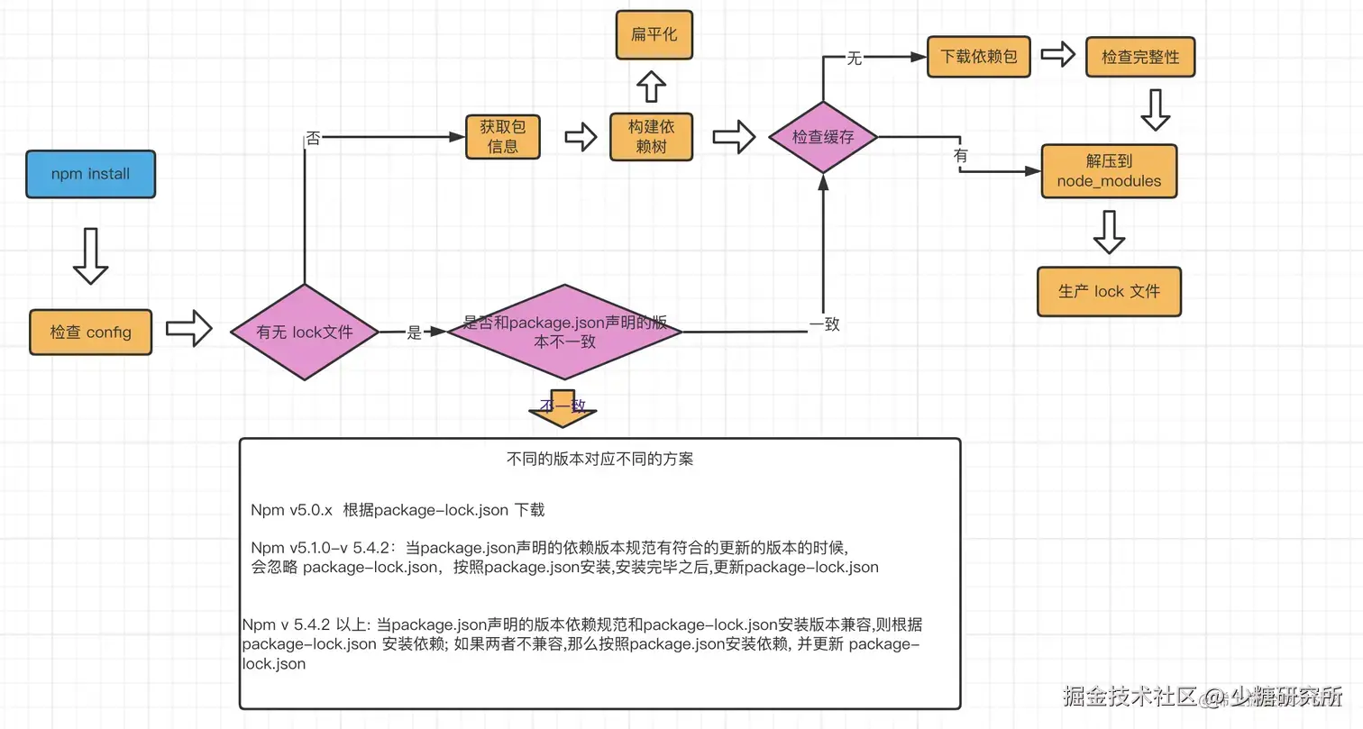 npm install 执行之后,首先,检查并获取 npm 配置,这里的优先级为:项目级的 .npmrc 文件 > 用户级的 .npmrc 文件> 全局级的 .npmrc 文件 > npm 内置的 .npmrc 文件。