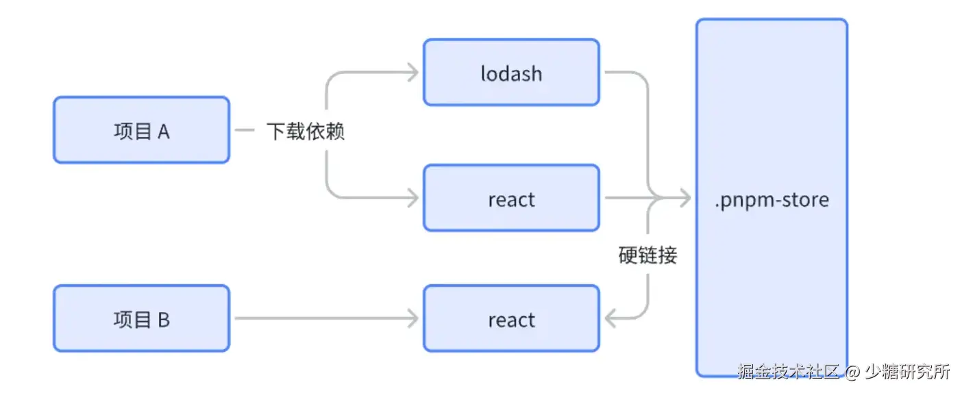 pnpm 通过使用全局的 .pnpm-store 来存储下载的包,使用硬链接来重用存储在全局存储中的包文件,这样不同项目中相同的包无需重复下载,节约磁盘空间。