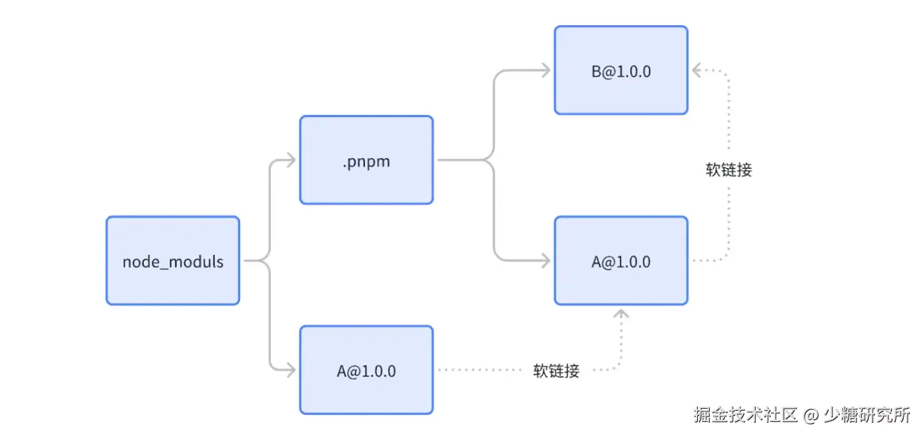 举个例子,项目中依赖了 A,这时候可以通过创建软链接,在 node_modules 根目录下创建 A 软链指向了 node_modules/.pnpm/A/node_modules/A。此时如果 A 依赖 B,pnpm 同样会把 B 放置在 .pnpm 中,A 同样可以通过 软链接依赖到 B,避免了嵌套过深的情况。