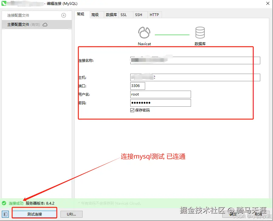 使用服务器IP 和设置的MYSQL 端口号、密码进行mysql数据库连接
