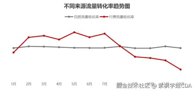 付费流量转化率下降明显,这说明:付费流量的质量下降,可能是投放渠道的用户精准度变差;付费广告可能吸引了很多低意向用户,导致他们访问但没有购买。