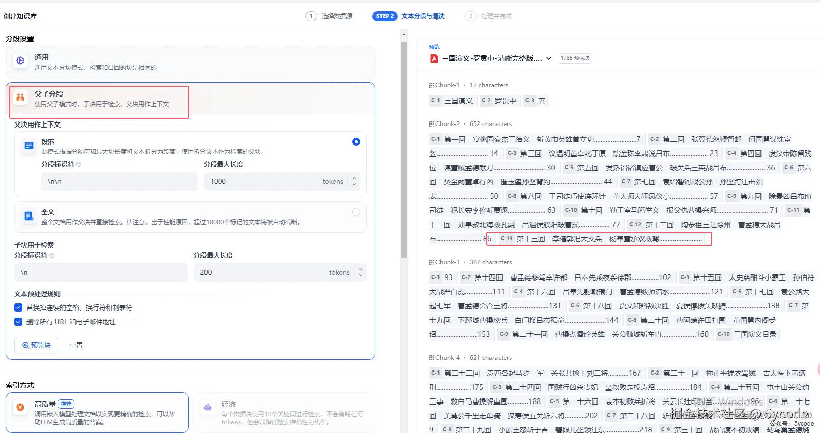 父子模式采用双层分段结构来平衡检索的精确度和上下文信息,让精准匹配与全面的上下文信息二者兼得。 关键点 1,父区块(Parent-chunk)保持较大的文本单位(如段落),上下文内容丰富且连贯。默认以\n\n为分段标识,如果知识不长,可以以整个作为父区块(超过1万个分段就直接被截断了)。 2,子区块(Child-chunk)以较小的文本单位(如句子),用于精确检索。默认以\n为分段标识。 3,也可以选择噪音清理 4,在搜索时通过子区块精确检索后,获取父区块来补充上下文信息,从而给LLM的上下文内容更丰富