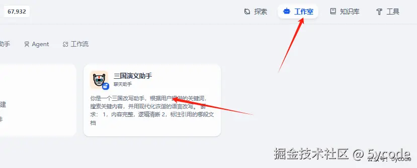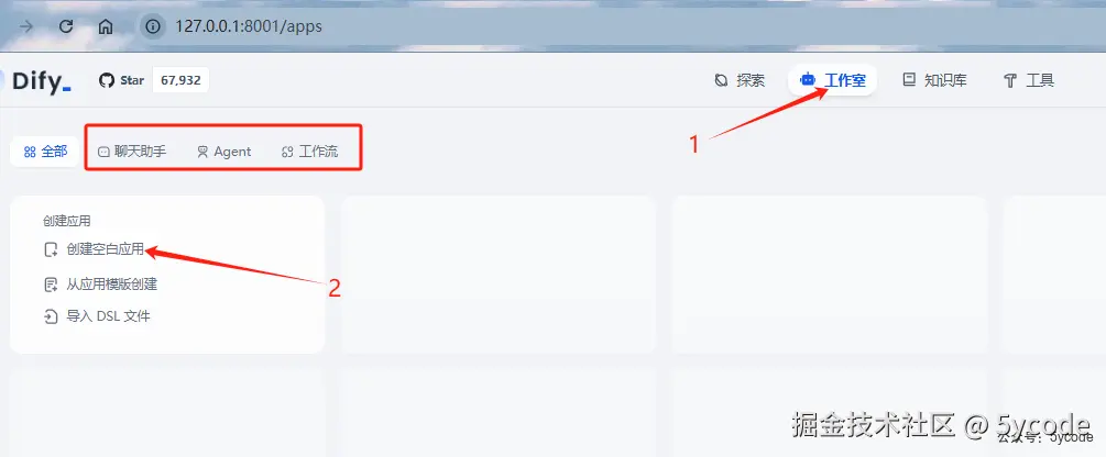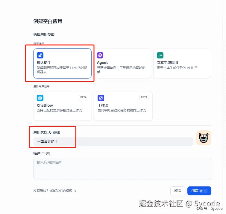 点击工作室,我们可以看到有很多丰富的应用,包括聊天助手、agent、工作流等 我们选择最简单的应用,聊天助手,点击5,创建空白应用