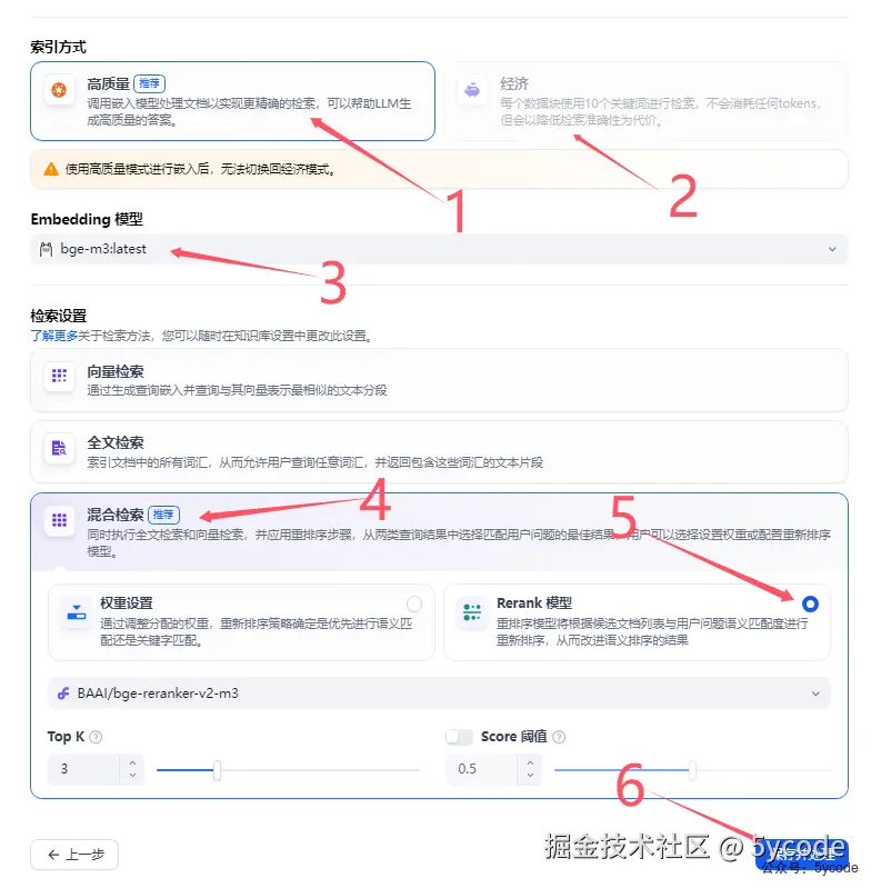 我们看下官方推荐的配置 1,选择高质量 3,选择向量模型 4,选择系统推荐的混合检索 5,选择Rerank模型,并选择对应的rerank模型