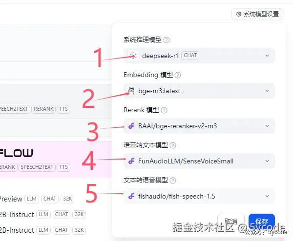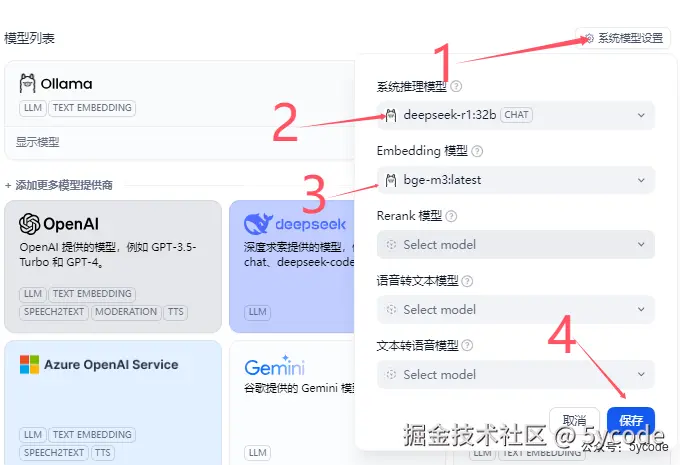 1,点击系统模型设置 2,选择已经配置的模型,当然建立知识库的时候,也可以切换 3,选择向量模型 4,保持
