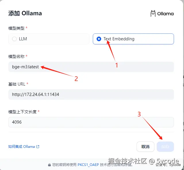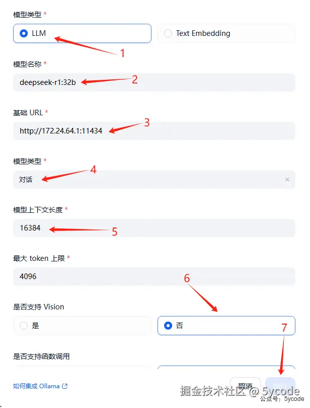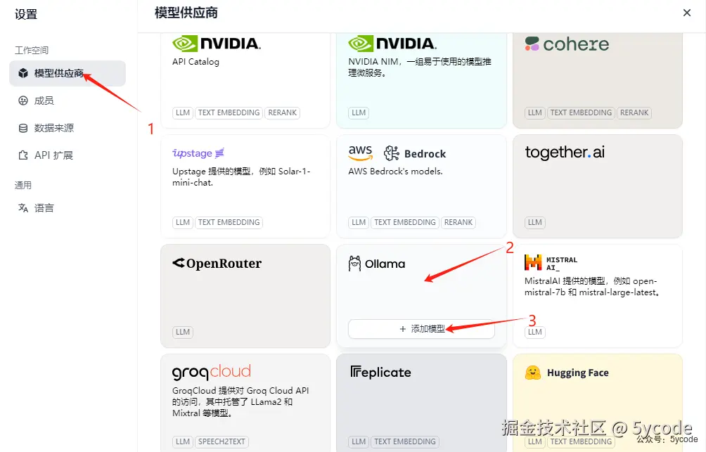 1, 点击模型供应商 2,下拉找到ollama 3,点击添加模型