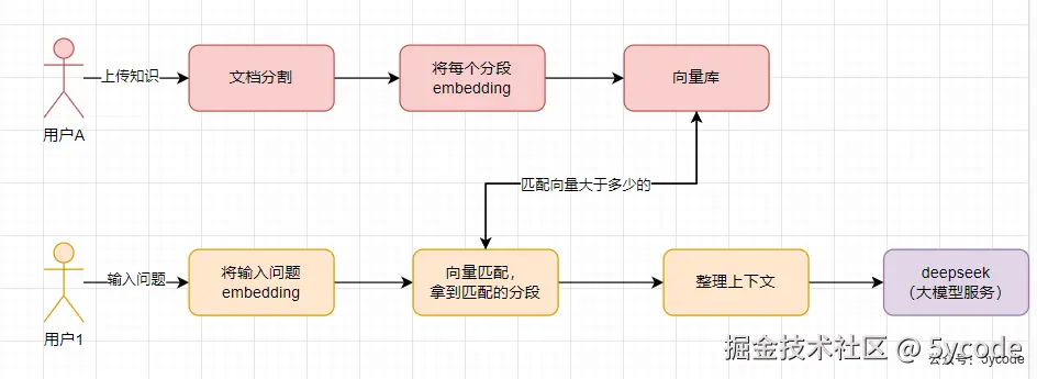 1,将用户输入问题转换为向量 2, 在向量库中检索相似内容 3, 将检索到的相关内容作为上下文提供给LLM
