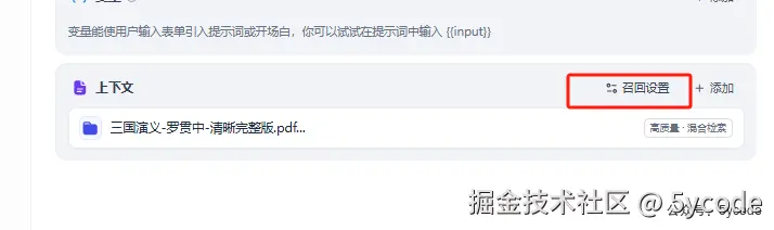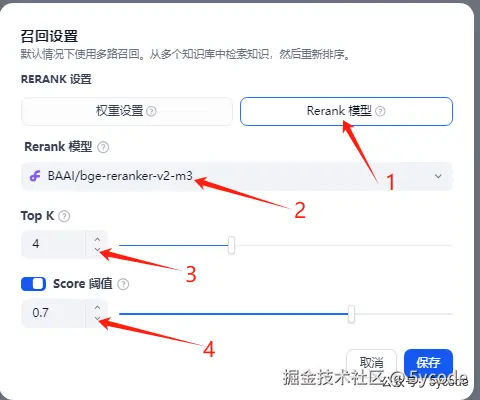 1,选择Rerank模型 2,选择相关的模型 3,设置召回数量(文本片段数量) 4,相似度匹配,设置0.7