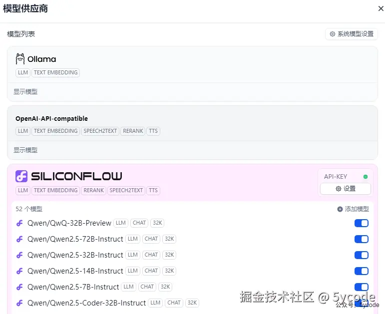 模型供应商 配置好以后,我们可以在模型列表那里看到所有的模型