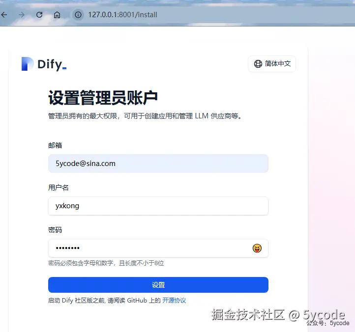 填写相关信息,设置管理员账户。