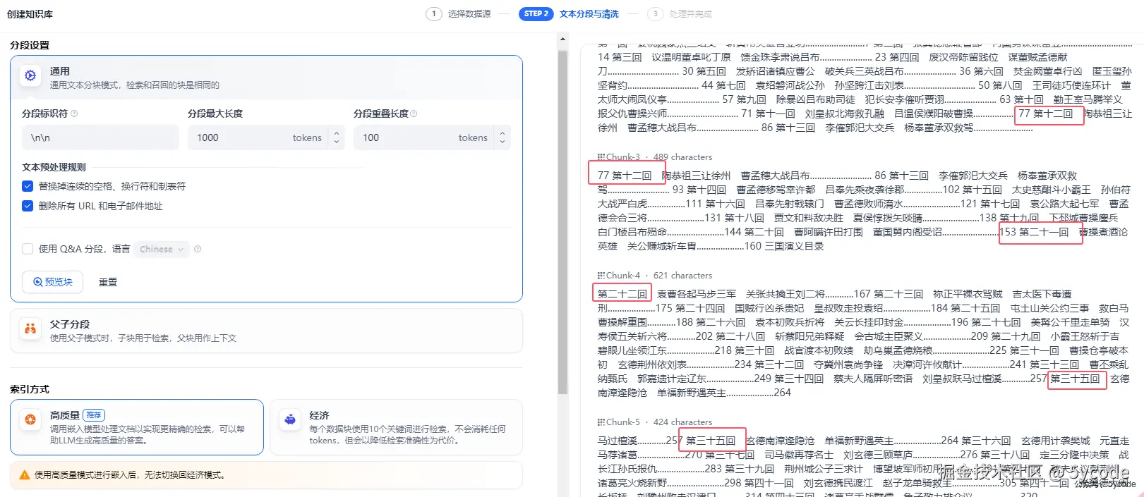 dify的分段有个好处,设置分段以后,可以实时预览,可以根据预览效果,自己实时调整分段策略。`dify建议首次创建知识库使用父子分段模式。